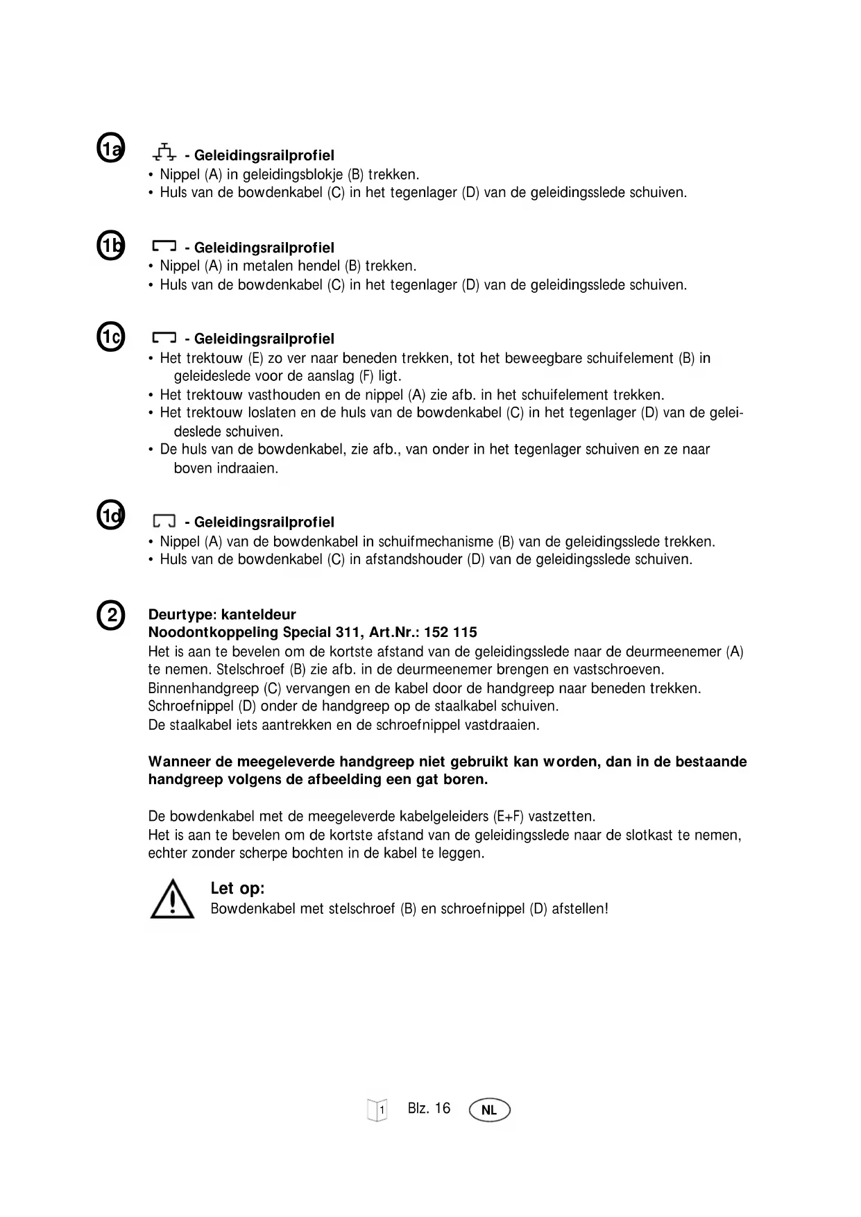 Deurtype: binnen de geveldraaiende kanteldeur Noodontkoppeling Special 301, Art.Nr.: 564 452 Binnenhandgreep vervangen en afstandskonsole (A) met een parker 4,2 x 9,5 aan de linkerzijde van de slotkast (B) vastschroeven. Bij sommige deurfabrikaten moet het gat voor bevestiging van afstandskonsole (A) eerst geboord worden. De afstand is 60 mm boven de binnenhandgreep; vanuit het midden van de handgreep gemeten. Boren met metaalboor ø 3,5 mm. Bowdenkabel eventueel iets inkorten en vervolgens met de stelschroef (C) aan de afstandskonsole vastzetten. Schroefnippel (D) losdraaien en eraf halen. Daarna de staalkabel door het tegenoverliggende gat van de binnenhandgreep trekken en de schroefnippel onder de binnenhandgreep weer op de staalkabel schuiven. De staalkabel iets aantrekken en de schroefnippel vastdraaien. De bowdenkabel (E) met behulp van twee kabelgeleiders (F) aan de binnenzijde van het deurblad vastzetten. Het is aan te bevelen om de kortste afstand van de geleidingsslede naar de slotkast te nemen, echter zonder scherpe bochten in de kabel te leggen. Let op: Bowdenkabel met stelschroef (C) spelingvrij afstellen!Blz 19