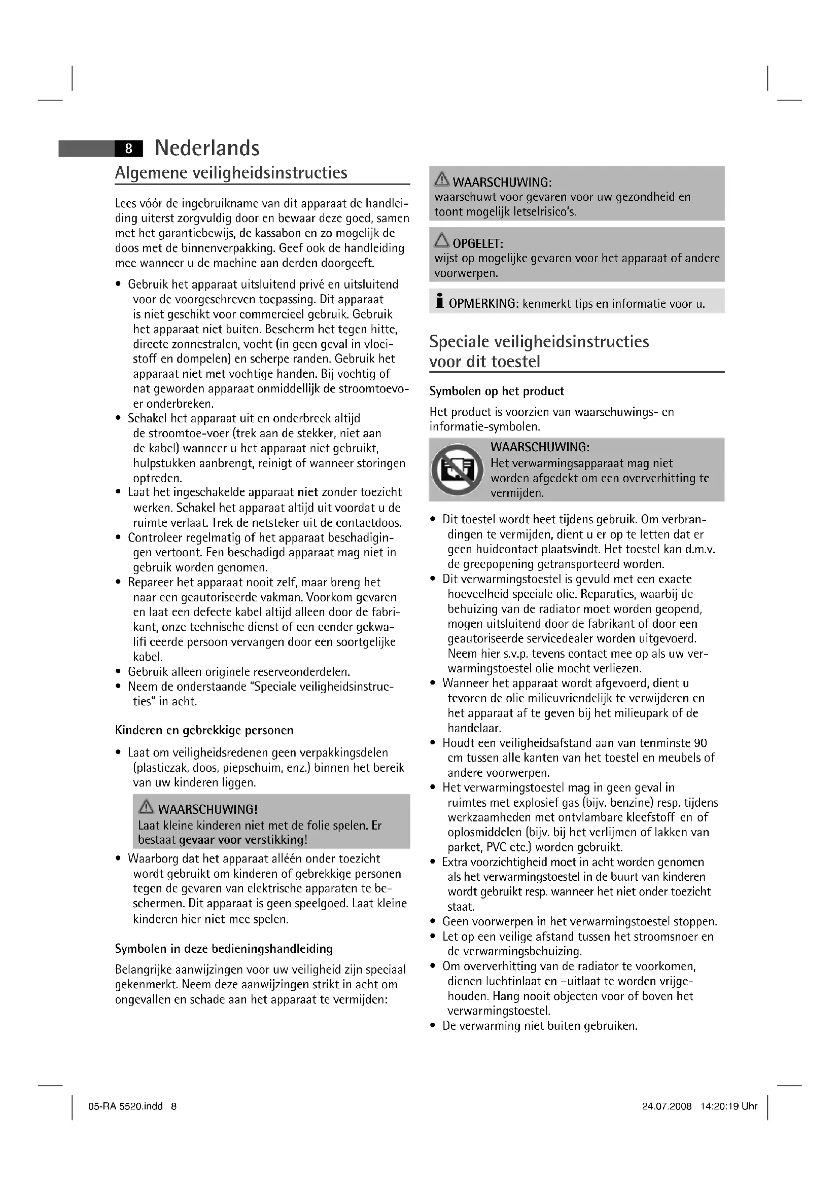 - Het verwarmingstoestel houdt vervolgens automa- tisch de gewenste temperatuur aan. OPGELET: Wanneer u het apparaat niet meer gebruikt, dient u altijd de netsteker uit de contactdoos te trekken. 05-RA 5520.indd 905-RA 5520.indd 9 24.07.2008 14:20:20 Uhr24.07.2008 14:20:20 UhrNederlands