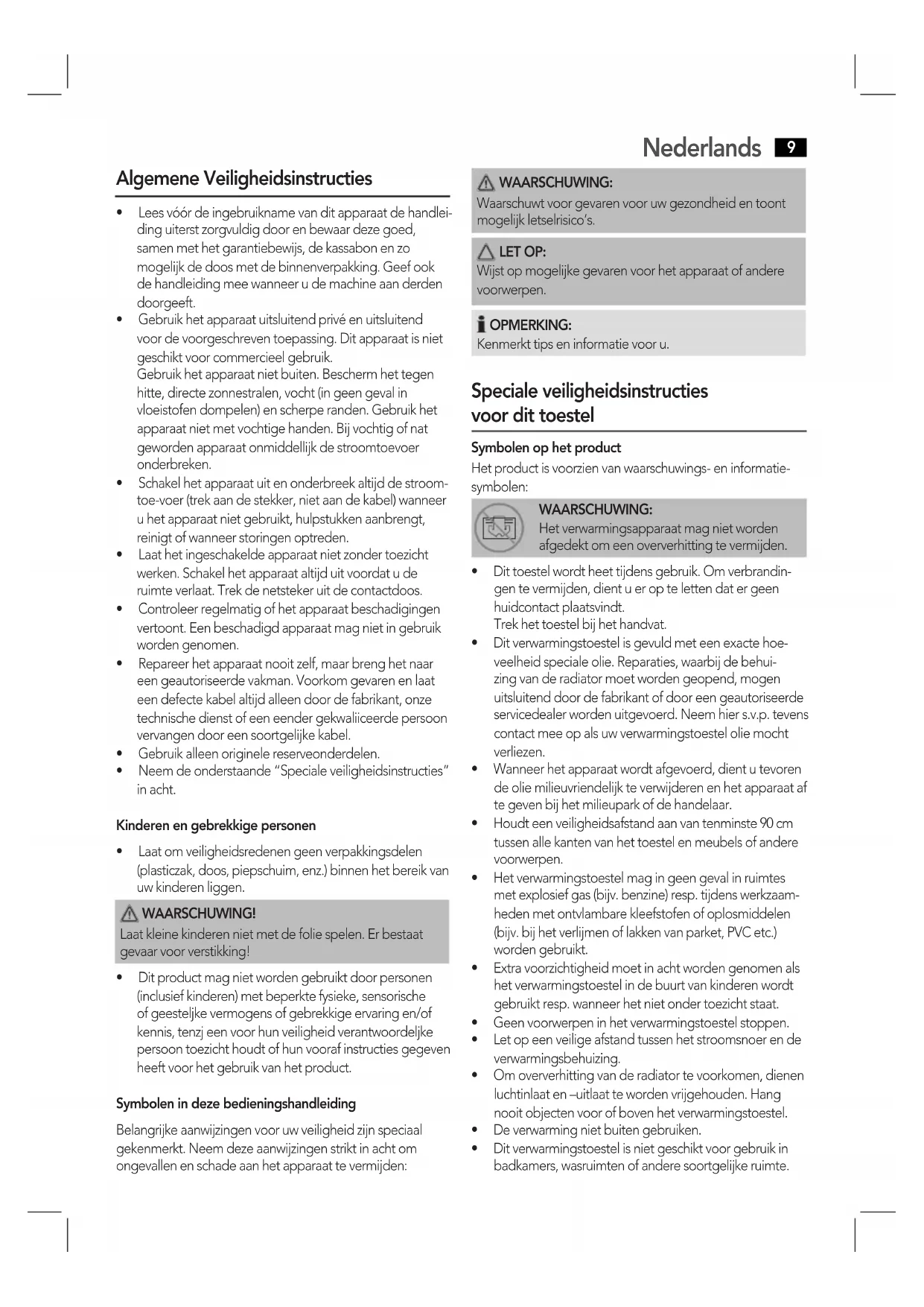 - Ditproductmagnietwordengebruiktdoorpersonen (inclusief kinderen) met beperkte fysieke, sensorische of geesteljke vermogens of gebrekkige ervaring en/of kennis, tenzj een voor hun veiligheid verantwoordeljke persoon toezicht houdt of hun vooraf instructies gegeven heeft voor het gebruik van het product. Symbolen in deze bedieningshandleiding Belangrijke aanwijzingen voor uw veiligheid zijn speciaal gekenmerkt. Neem deze aanwijzingen strikt in acht om ongevallenenschadeaanhetapparaattevermden: WAARSCHUWING: Waarschuwt voor gevaren voor uw gezondheid en toont mogelijk letselrisico’s. LET OP: Wijst op mogelijke gevaren voor het apparaat of andere voorwerpen. OPMERKING: Kenmerkt tips en informatie voor u. Speciale veiligheidsinstructies voor dit toestel Symbolen op het product Het product is voorzien van waarschuwings- en informatie- symbolen: WAARSCHUWING: Het verwarmingsapparaat mag niet worden afgedekt om een oververhitting te vermijden.