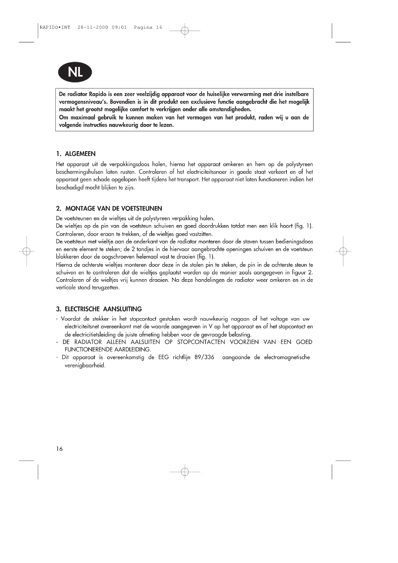 RAPIDO•INT 28-11-2000 09:01 Pagina 1516 De radiator Rapido is een zeer veelzijdig apparaat voor de huiselijke verwarming met drie instelbare vermogensniveau’s. Bovendien is in dit produkt een exclusieve functie aangebracht die het mogelijk maakt het grootst mogelijke comfort te verkrijgen onder alle omstandigheden. Om maximaal gebruik te kunnen maken van het vermogen van het produkt, raden wij u aan de volgende instructies nauwkeurig door te lezen.
