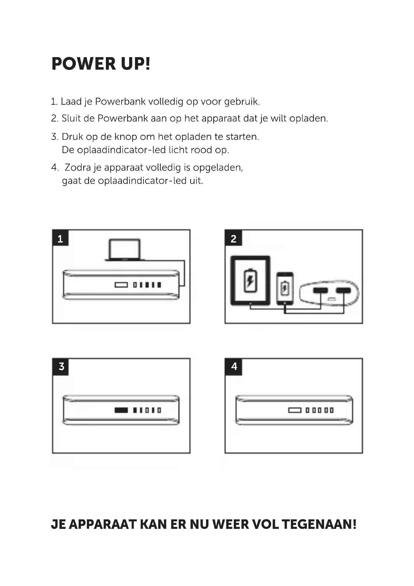1. Laad je Powerbank volledig op voor gebruik.
