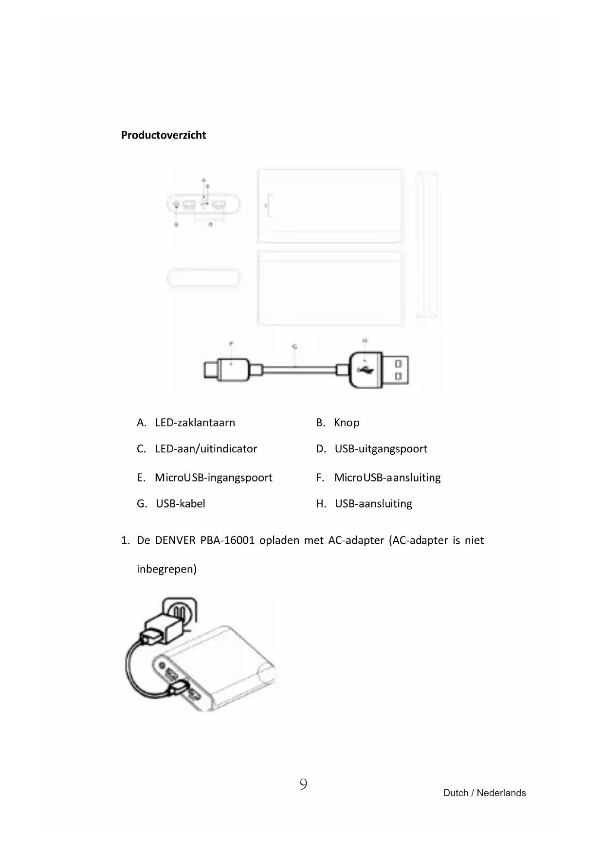 - Controller of de laadspanning van het digitale product overeenkomt met de DC 5V uitgangsspanning van de DENVER PBA-16001.