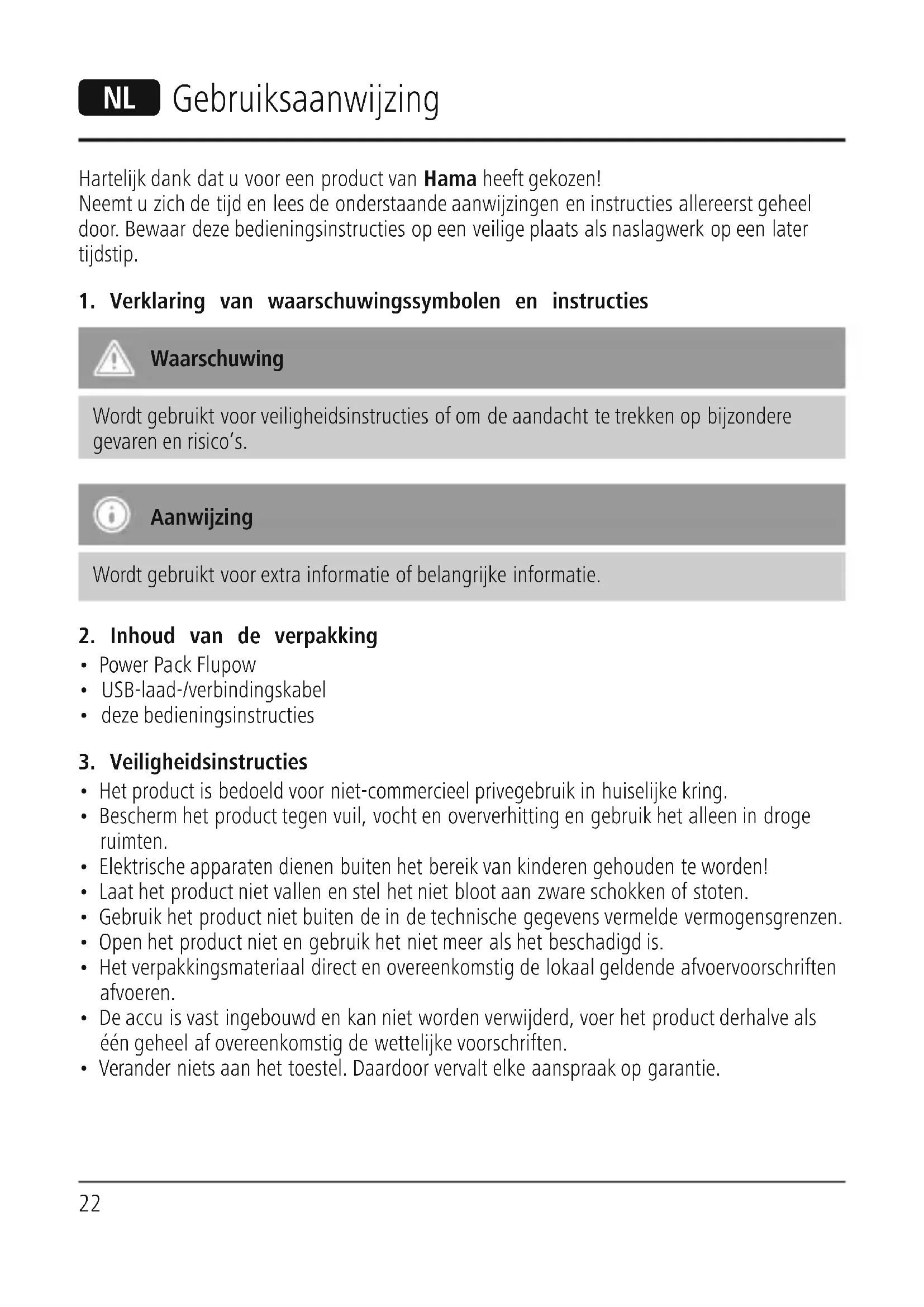 Notitie aangaande de bescherming van het milieu: Ten gevolge van de invoering van de Europese Richtlijn 2012/19/EU en 2006/66/ EU in het nationaal juridisch system, is het volgende van toepassing: Elektrische en elektronische apparatuur, zoals batterijen mag niet met het huisvuil weggegooid worden. Consumenten zijn wettelijk verplicht om electrische en elctronische apparaten zoals batterijen op het einde van gebruik in te dienen bij openbare verzamelplaatsen speciaal opgezet voor dit doeleinde of bij een verkooppunt. Verdere specicaties aangaande dit onderwerp zijn omschreven door de nationale wet van het betreffende land. Dit symbool op het product, de gebruiksaanwijzing of de verpakking duidt erop dat het product onderworpen is aan deze richtlijnen. Door te recycleren, hergebruiken van materialen of andere vormen van hergebruiken van oude toestellen/batterijen, levert u een grote bijdrage aan de bescherming van het mileu.26 Dziękujemy, że zdecydowali się Państwo na zakup produktu Hama! Prosimy poświęcić trochę czasu na uważne przeczytanie poniższych instrukcji i informacji. Przechowywać niniejszą instrukcję obsługi w bezpiecznym miejscu do późniejszego użytku.