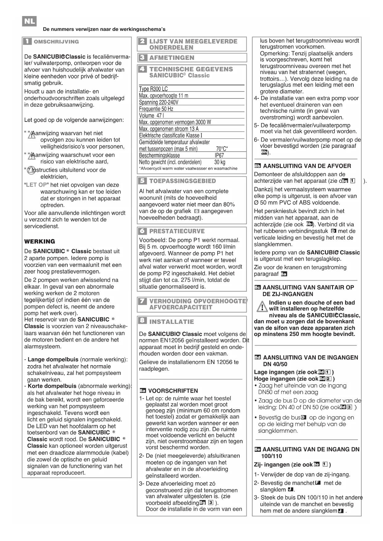 Classic moet volgens de normen EN12056 geïnstalleerd worden. Dit apparaat moet in bedrijf gesteld en onde- rhouden worden door een vakman. Gelieve de installatienorm EN 12056 te raadplegen. VOORSCHRIFTEN