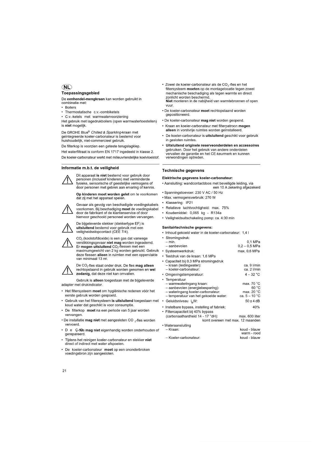Chilled & Sparkling-kraan met geïntegreerde koeler-carbonateur is bestemd voor huishoudelijk, niet-commercieel gebruik. De filterkop is voorzien een geteste terugslagklep. Het waterfiltraat is conform EN 1717 ingedeeld in klasse 2. De koeler-carbonateur werkt met milieuvriendelijke koelvloeistof. Informatie m.b.t. de veiligheid Dit apparaat is niet bestemd voor gebruik door personen (inclusief kinderen) met verminderde fysieke, sensorische of geestelijke vermogens of door personen met gebrek aan ervaring of kennis. Op kinderen moet worden gelet om te voorkomen dat zij met het apparaat spelen. Gevaar als gevolg van beschadigde voedingskabels voorkomen. Bij beschadiging moet de voedingskabel door de fabrikant of de klantenservice of door hiervoor geschoold personeel worden vervangen. De bijgeleverde stekker (stekkertype EF) is uitsluitend bestemd voor gebruik met een veiligheidsstopcontact (CEE 7/4).