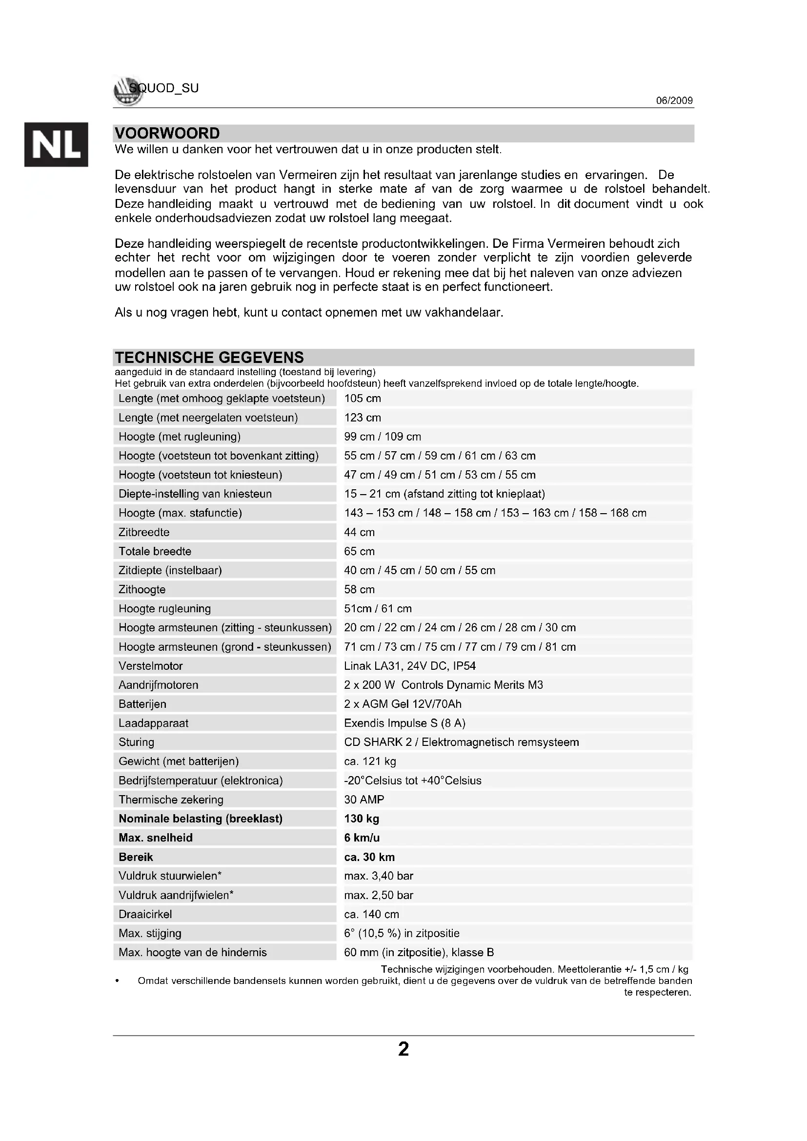 TECHNISCHE GEGEVENS aangeduid in de standaard instelling (toestand bij levering) Het gebruik van extra onderdelen (bijvoorbeeld hoofdsteun) heeft vanzelfsprekend invloed op de totale lengte/hoogte. Lengte (met omhoog geklapte voetsteun) 105 cm Lengte (met neergelaten voetsteun) 123 cm Hoogte (met rugleuning) 99 cm / 109 cm Hoogte (voetsteun tot bovenkant zitting) 55 cm / 57 cm / 59 cm / 61 cm / 63 cm Hoogte (voetsteun tot kniesteun) 47 cm / 49 cm / 51 cm / 53 cm / 55 cm Diepte-instelling van kniesteun 15 – 21 cm (afstand zitting tot knieplaat) Hoogte (max. stafunctie) 143 – 153 cm / 148 – 158 cm / 153 – 163 cm / 158 – 168 cm Zitbreedte 44 cm Totale breedte 65 cm Zitdiepte (instelbaar) 40 cm / 45 cm / 50 cm / 55 cm Zithoogte 58 cm Hoogte rugleuning 51cm / 61 cm Hoogte armsteunen (zitting - steunkussen) 20 cm / 22 cm / 24 cm / 26 cm / 28 cm / 30 cm Hoogte armsteunen (grond - steunkussen) 71 cm / 73 cm / 75 cm / 77 cm / 79 cm / 81 cm Verstelmotor Linak LA31, 24V DC, IP54 Aandrijfmotoren 2 x 200 W Controls Dynamic Merits M3 Batterijen 2 x AGM Gel 12V/70Ah Laadapparaat Exendis Impulse S (8 A) Sturing CD SHARK 2 / Elektromagnetisch remsysteem Gewicht (met batterijen) ca. 121 kg Bedrijfstemperatuur (elektronica) -20°Celsius tot +40°Celsius Thermische zekering 30 AMP Nominale belasting (breeklast) 130 kg Max. snelheid 6 km/u Bereik ca. 30 km Vuldruk stuurwielen* max. 3,40 bar Vuldruk aandrijfwielen* max. 2,50 bar Draaicirkel ca. 140 cm Max. stijging 6° (10,5 %) in zitpositie Max. hoogte van de hindernis 60 mm (in zitpositie), klasse B Technische wijzigingen voorbehouden. Meettolerantie +/- 1,5 cm / kg