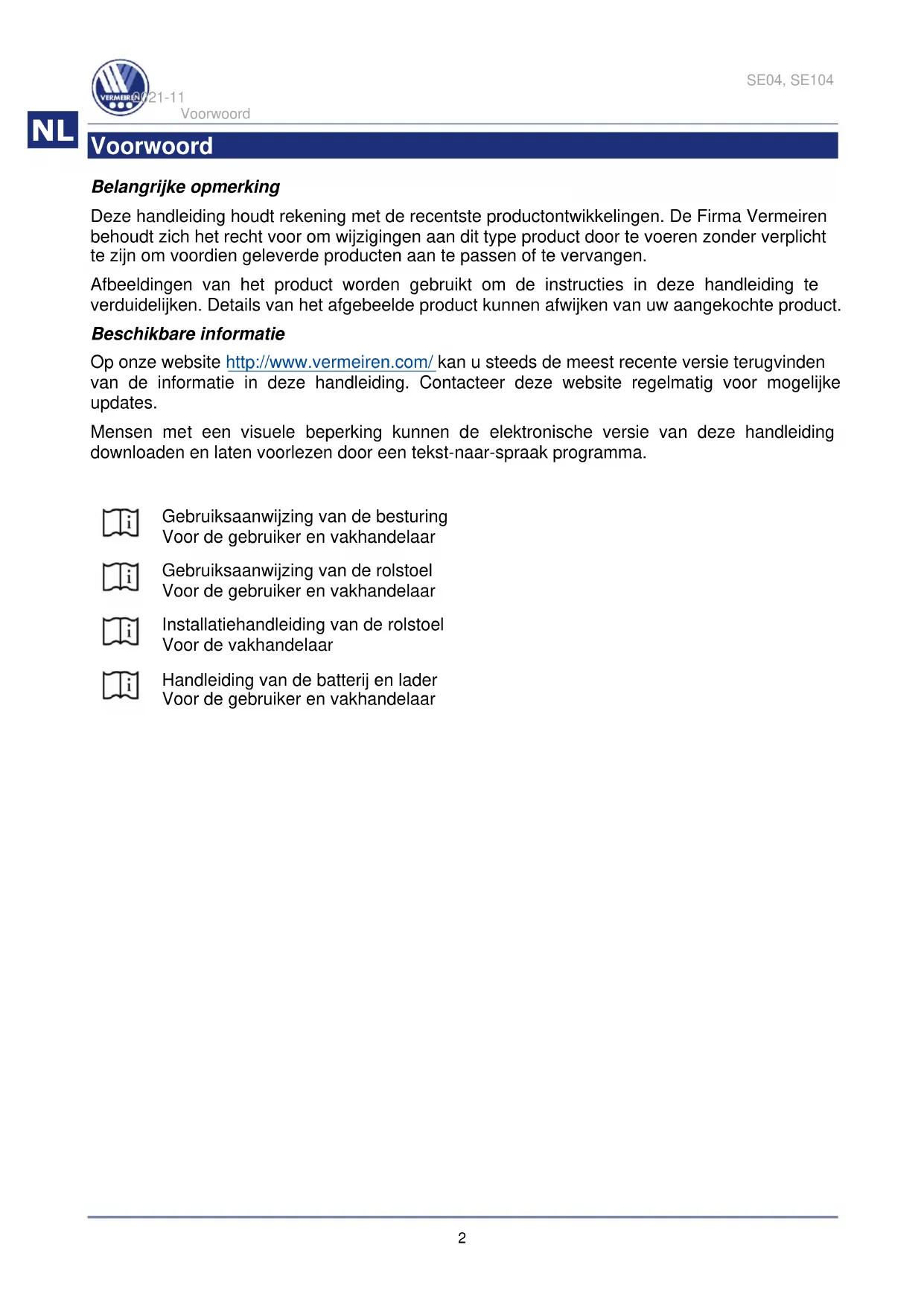 Vermeiren is verantwoordelijk voor software-updates en herstellingen. Voor aanpassingen aan de software, contacteer Vermeiren. Zie onze website: http://www.vermeiren.com/SE04, SE104 2021-11 Rijden