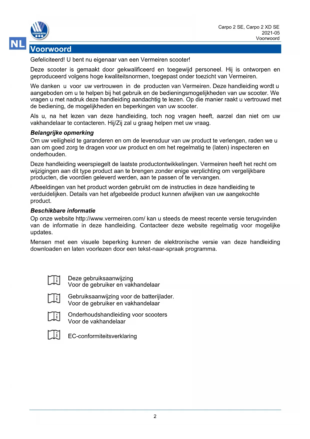 Voorwoord Gefeliciteerd! U bent nu eigenaar van een Vermeiren scooter! Deze scooter is gemaakt door gekwalificeerd en toegewijd personeel. Hij is ontworpen en geproduceerd volgens hoge kwaliteitsnormen, toegepast onder toezicht van Vermeiren. We danken u voor uw vertrouwen in de producten van Vermeiren. Deze handleiding wordt u aangeboden om u te helpen bij het gebruik en de bedieningsmogelijkheden van uw scooter. We vragen u met nadruk deze handleiding aandachtig te lezen. Op die manier raakt u vertrouwd met de bediening, de mogelijkheden en beperkingen van uw scooter. Als u, na het lezen van deze handleiding, toch nog vragen heeft, aarzel dan niet om uw vakhandelaar te contacteren. Hij/Zij zal u graag helpen met uw vraag. Belangrijke opmerking Om uw veiligheid te garanderen en om de levensduur van uw product te verlengen, raden we u aan om goed zorg te dragen voor uw product en om het regelmatig te (laten) inspecteren en onderhouden. Deze handleiding weerspiegelt de laatste productontwikkelingen. Vermeiren heeft het recht om wijzigingen aan dit type product aan te brengen zonder enige verplichting om vergelijkbare producten, die voordien geleverd werden, aan te passen of te vervangen. Afbeeldingen van het product worden gebruikt om de instructies in deze handleiding te verduidelijken. Details van het afgebeelde product kunnen afwijken van uw aangekochte product. Beschikbare informatie Op onze website http://www.vermeiren.com/ kan u steeds de meest recente versie terugvinden van de informatie in deze handleiding. Contacteer deze website regelmatig voor mogelijke updates. Mensen met een visuele beperking kunnen de elektronische versie van deze handleiding downloaden en laten voorlezen door een tekst-naar-spraak programma.