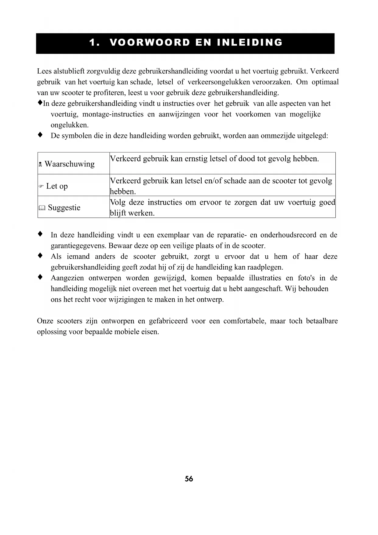 Aangezien ontwerpen worden gewijzigd, komen bepaalde illustraties en foto's in de handleiding mogelijk niet overeen met het voertuig dat u hebt aangeschaft. Wij behouden ons het recht voor wijzigingen te maken in het ontwerp. Onze scooters zijn ontworpen en gefabriceerd voor een comfortabele, maar toch betaalbare oplossing voor bepaalde mobiele eisen. 1 . VO O R WO O R D E N I N L E I D I N G57 2 . O P M E R K I N G OV E R V E I L I G H E I D