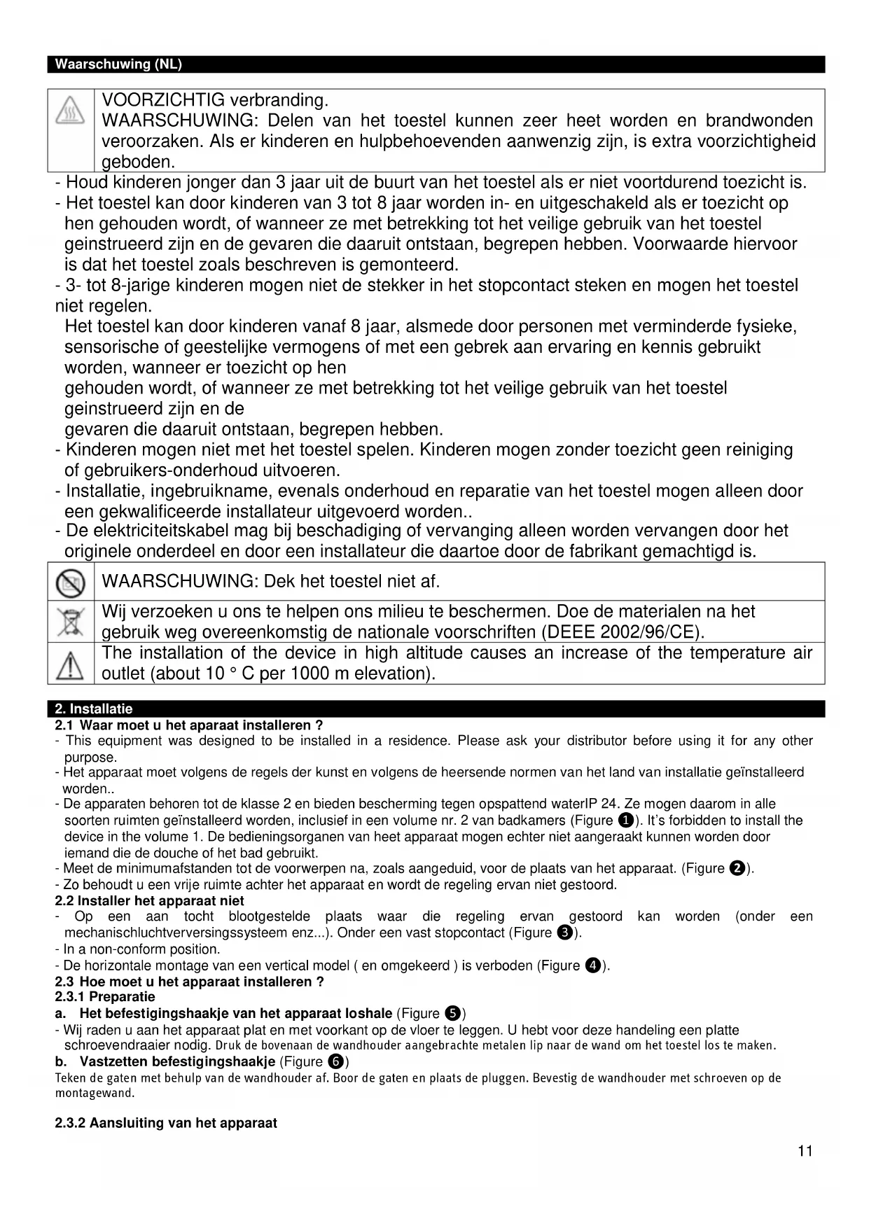 VOORZICHTIG verbranding. WAARSCHUWING: Delen van het toestel kunnen zeer heet worden en brandwonden veroorzaken. Als er kinderen en hulpbehoevenden aanwenzig zijn, is extra voorzichtigheid geboden. - Houd kinderen jonger dan 3 jaar uit de buurt van het toestel als er niet voortdurend toezicht is. - Het toestel kan door kinderen van 3 tot 8 jaar worden in- en uitgeschakeld als er toezicht op hen gehouden wordt, of wanneer ze met betrekking tot het veilige gebruik van het toestel geinstrueerd zijn en de gevaren die daaruit ontstaan, begrepen hebben. Voorwaarde hiervoor is dat het toestel zoals beschreven is gemonteerd. - 3- tot 8-jarige kinderen mogen niet de stekker in het stopcontact steken en mogen het toestel niet regelen. Het toestel kan door kinderen vanaf 8 jaar, alsmede door personen met verminderde fysieke, sensorische of geestelijke vermogens of met een gebrek aan ervaring en kennis gebruikt worden, wanneer er toezicht op hen gehouden wordt, of wanneer ze met betrekking tot het veilige gebruik van het toestel geinstrueerd zijn en de gevaren die daaruit ontstaan, begrepen hebben. - Kinderen mogen niet met het toestel spelen. Kinderen mogen zonder toezicht geen reiniging of gebruikers-onderhoud uitvoeren. - Installatie, ingebruikname, evenals onderhoud en reparatie van het toestel mogen alleen door een gekwalificeerde installateur uitgevoerd worden.. - De elektriciteitskabel mag bij beschadiging of vervanging alleen worden vervangen door het originele onderdeel en door een installateur die daartoe door de fabrikant gemachtigd is.