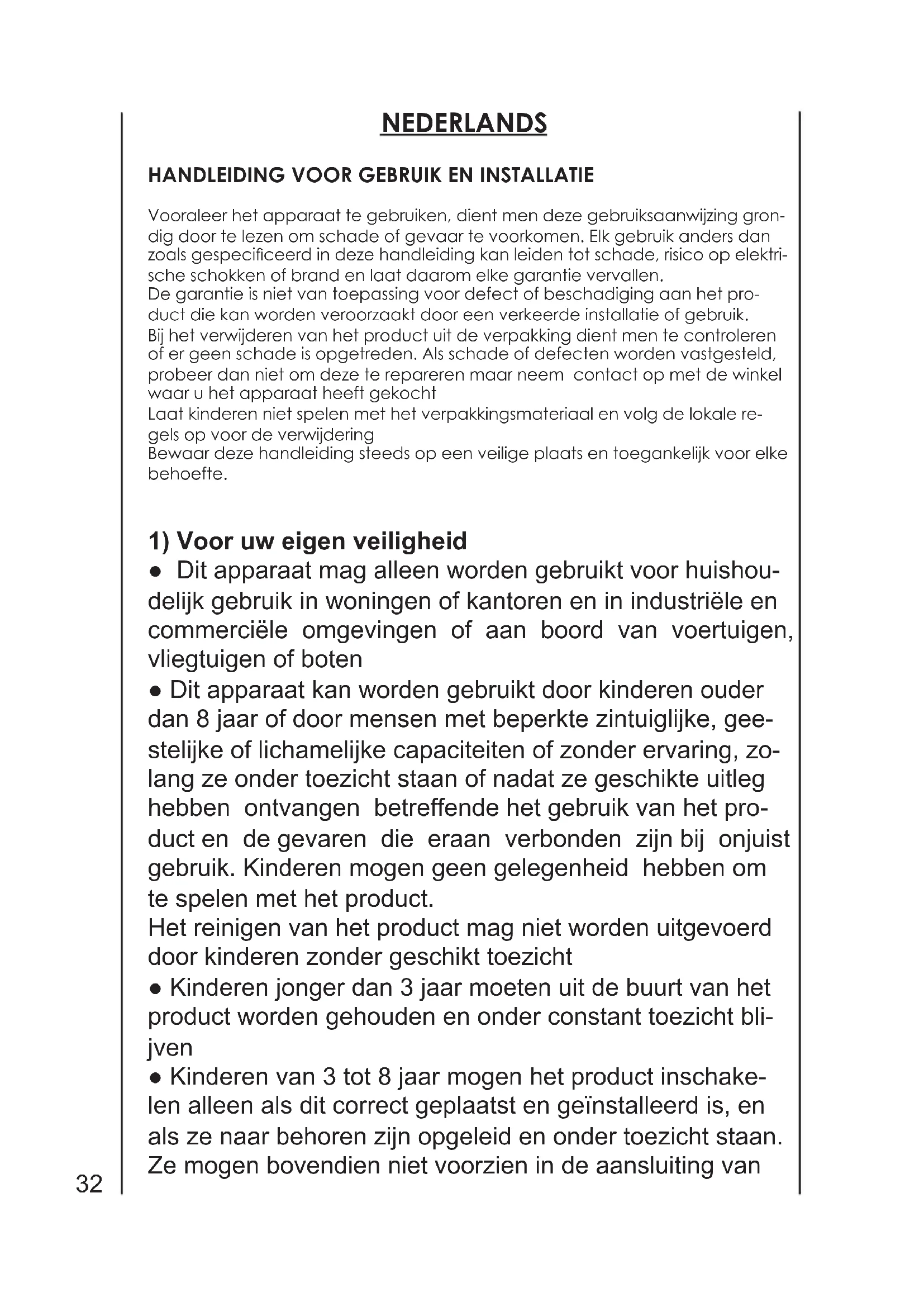 - WAARSCHUWING: het product is niet uitgerust met inrichtingen voor het regelen van de kamertemperatuur. Niet gebruiken in kleine ruimtes, waar zich personen bevinden met een beperkte motorische vaardigheid, tenzij ze onder voortdurend toezicht staan van een persoon die verantwoordelijk is voor hun veiligheid.