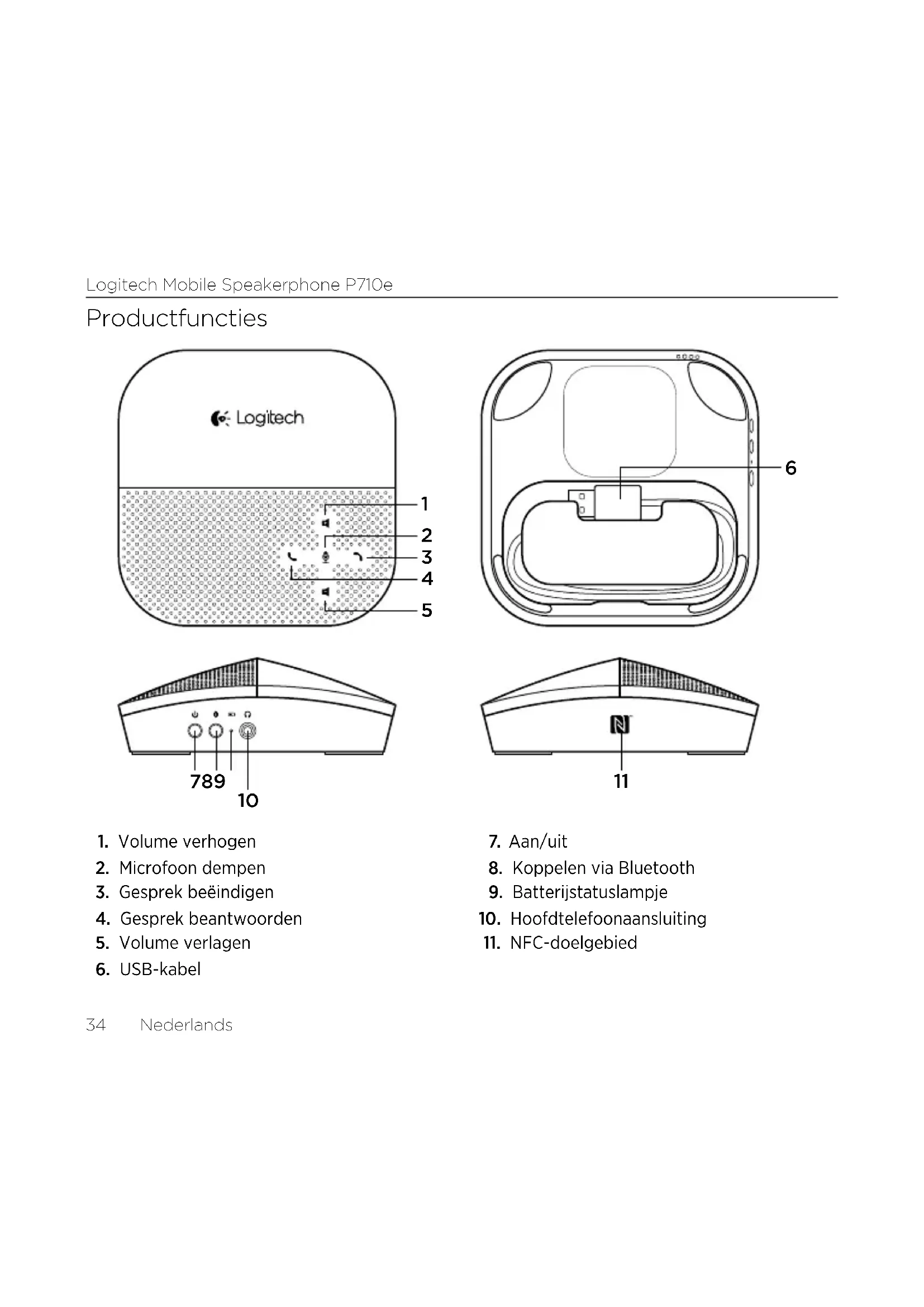 2Logitech Mobile Speakerphone P710e Nederlands 35 Aan/uit-knop Hiermee zet u de P710e aan of uit Knop voor koppelen via Bluetooth Houd ingedrukt totdat blauwe lampjes in een cirkel op de bovenkant van het apparaat verschijnen om de P710e in koppelingsmodus te plaatsen Indicator voor batterijniveau Branden groen wanneer batterij volledig is opgeladen, rood wanneer de batterij nog 30 minuten meegaat, knippert rood tijdens opladen Knop voor gesprek beantwoorden Druk hierop om gesprekken te beantwoorden Knop voor gesprek beëindigen/afwijzen Druk hierop om een gesprek te beëindigen of een inkomend gesprek af te wijzen Knop voor volume omhoog Druk hierop om het speakervolume te verhogen Knop voor volume omlaag Druk hierop om het speakervolume te verlagen Microfoonknop Druk hierop om de dempfunctie van de microfoon in of uit te schakelen NFC-doelgebied Plaats de NFC-antenne van uw mobiele apparaat in de buurt van het doelgebied om te koppelen of verbinding te maken/verbreken Het is raadzaam de P710e op te laden voordat u deze voor het eerst gebruikt. U kunt dit doen door de speaker aan te sluiten op een USB-poort op een computer of op een willekeurige USB-wisselstroomadapter.Logitech Mobile Speakerphone P710e 36 Nederlands Inzetstuk/schuifbare bovenkant De bovenkant van de P710e kan worden verschoven zodat een verborgen houder voor uw mobiele apparaat tevoorschijn komt. Deze houder is vooral handig wanneer u uw mobiele apparaat gebruikt voor videovergaderingen voor meer stabiliteit van het beeld voor degenen met wie u belt. Er is een inzetstuk dat in de houder kan worden gebruikt om deze aan te passen aan het formaat van uw mobiele apparaat. Het inzetstuk kan op twee manieren worden geplaatst (zie afbeeldingen). Het geschatte formaat van een mobiel apparaat dat in de houder past is: Zijde 2: 0 mm–8,5 mm Zijde 1: 8,5 mm–10,5 mmLogitech Mobile Speakerphone P710e Nederlands 37 Eerste set-up van het apparaat