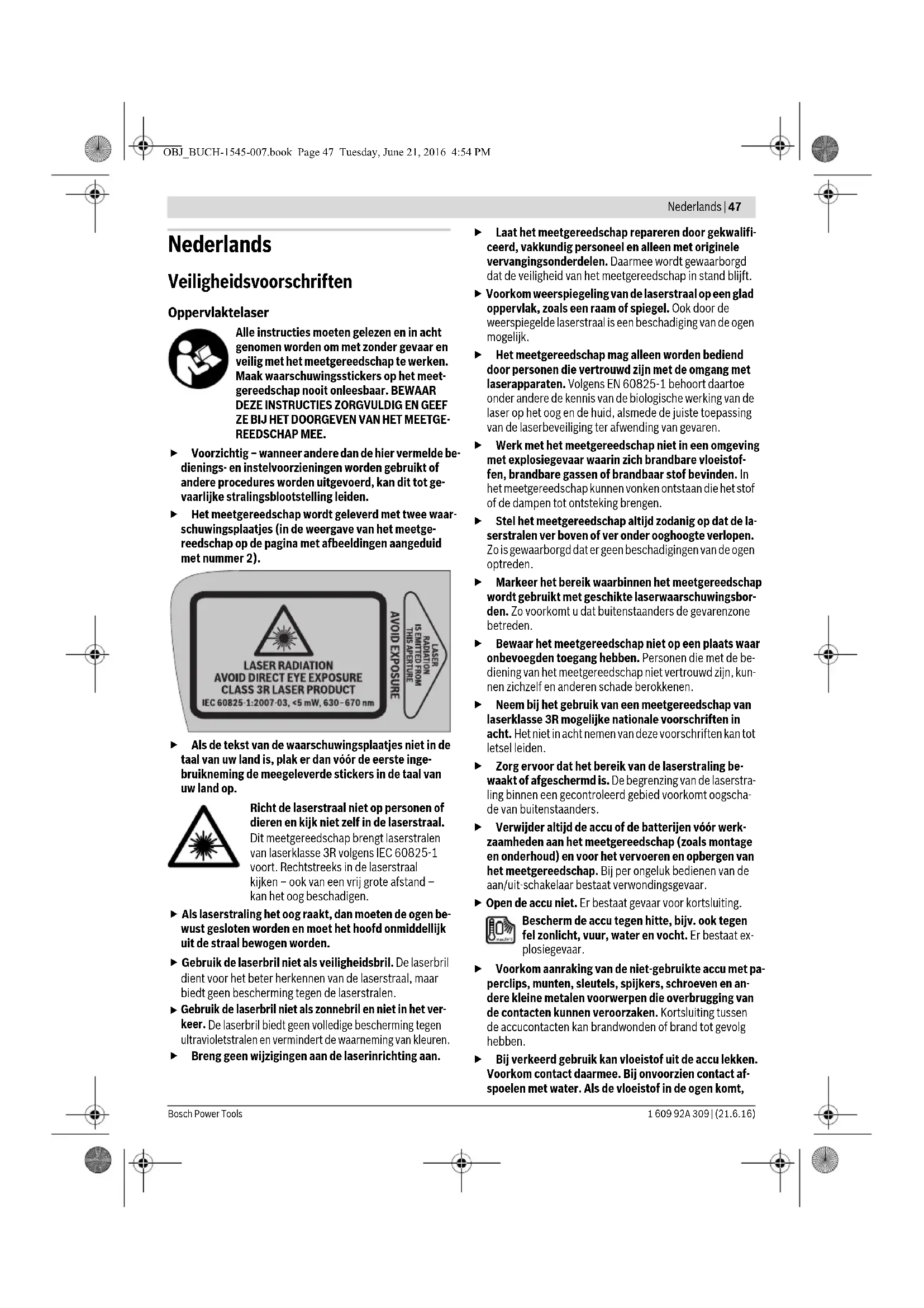 ZE BIJ HET DOORGEVEN VAN HET MEETGE- REEDSCHAP MEE. Voorzichtig – wanneer andere dan de hier vermelde be- dienings- en instelvoorzieningen worden gebruikt of andere procedures worden uitgevoerd, kan dit tot ge- vaarlijke stralingsblootstelling leiden. Het meetgereedschap wordt geleverd met twee waar- schuwingsplaatjes (in de weergave van het meetge- reedschap op de pagina met afbeeldingen aangeduid met nummer 2). Als de tekst van de waarschuwingsplaatjes niet in de taal van uw land is, plak er dan vóór de eerste inge- bruikneming de meegeleverde stickers in de taal van uw land op. Richt de laserstraal niet op personen of dieren en kijk niet zelf in de laserstraal. Dit meetgereedschap brengt laserstralen van laserklasse 3R volgens IEC60825-1 voort. Rechtstreeks in de laserstraal kijken – ook van een vrij grote afstand – kan het oog beschadigen. Als laserstraling het oog raakt, dan moeten de ogen be- wust gesloten worden en moet het hoofd onmiddellijk uit de straal bewogen worden. Gebruik de laserbril niet als veiligheidsbril. De laserbril dient voor het beter herkennen van de laserstraal, maar biedt geen bescherming tegen de laserstralen.