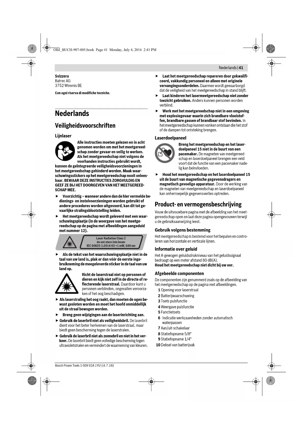 heden (zoals fel zonlicht). Het serienummer 13 op het typeplaatje dient voor de eenduidige iden- tificatie van uw meetgereedschap. OBJ_BUCH-907-005.book Page 42 Monday, July 4, 2016 2:41 PMNederlands | 43 Bosch Power Tools 1 609 92A 1YU | (4.7.16) In- en uitschakelen Als u het meetgereedschap wilt inschakelen duwt u de aan/uit-schakelaar 7 in de stand „on” (voor werkzaamhe- den zonder automatisch waterpassen) of in de stand „on” (voor werkzaamheden met automatisch waterpassen). On- middellijk na het inschakelen zendt het meetgereedschap la- serlijnen uit de laserstraalopeningen 1. Richt de laserstraal niet op personen of dieren en kijk zelf niet in de laserstraal, ook niet vanaf een grote afstand. Laat het ingeschakelde meetgereedschap niet onbe- heerd achter en schakel het meetgereedschap na ge- bruik uit. Andere personen kunnen door de laserstraal verblind worden. Als u het meetgereedschap wilt uitschakelen, duwt u de aan/uit-schakelaar 7 in de stand „off”. Als u het meetgereed- schap uitschakelt, wordt de pendeleenheid vergrendeld. Bij het overschrijden van de maximaal toegestane bedrijfstem- peratuur van 45 °C vindt uitschakeling plaats om de laserdiode te beschermen. Na het afkoelen is het meetgereedschap weer gereed voor gebruik en kan het opnieuw worden ingeschakeld. Automatische uitschakeling deactiveren Als er gedurende ca. 30 minuten geen toets op het meetge- reedschap wordt ingedrukt, wordt het meetgereedschap au- tomatisch uitgeschakeld om de batterijen te ontzien. Als u het meetgereedschap na de automatische uitschakeling weer wilt inschakelen, kunt u de aan/uit-schakelaar 7 eerst in de stand „off” duwen en het meetgereedschap vervolgens weer inschakelen, of u drukt eenmaal op de functietoets 5 of de toets Pulsfunctie 3. Als u de automatische uitschakeling wilt deactiveren, houdt u de functietoets 5 gedurende minstens 3 seconden ingedrukt terwijl het meetgereedschap ingeschakeld is. Als de automa- tische uitschakeling gedeactiveerd is, knipperen de laserstra- len kort ter bevestiging. Als u de automatische uitschakeling wilt activeren, schakelt u het meetgereedschap uit en weer in, of u houdt in plaats daar- van de functietoets 5 minstens 3 seconden ingedrukt. Geluidssignaal deactiveren Na het inschakelen van het meetgereedschap is het geluids- signaal altijd geactiveerd. Als u het geluidssignaal wilt deactiveren of activeren, drukt u tegelijkertijd de functietoets 5 en de toets Pulsfunctie in 3 en houdt u deze minstens 3 seconden ingedrukt. Bij het activeren en deactiveren klinken drie korte geluidssig- nalen ter bevestiging. Functies Het meetgereedschap beschikt over drie functies. U kunt op elk gewenst moment tussen de functies wisselen: – Horizontale functie: brengt een horizontaal laservlak voort, – Verticale functie: brengt een verticaal laservlak voort, – Snijlijnfunctie: brengt een horizontaal en een verticaal la- servlak voort. Na het inschakelen bevindt het meetgereedschap zich in de horizontale functie. Als u van functie wilt wisselen, drukt u op de functietoets 5. Alle drie functies kunt u met of zonder automatisch nivelleren kiezen. Pulsfunctie Voor werkzaamheden met de laserontvanger 17 moet – onaf- hankelijk van de gekozen functie – de pulsfunctie worden ge- activeerd. In de pulsfunctie knipperen de laserlijnen met een zeer hoge frequentie en kunnen daardoor door de laserontvanger 17 worden gevonden. Als u de pulsfunctie wilt inschakelen, drukt u op de toets 3. Als de pulsfunctie ingeschakeld is, brandt de indicatie 4 groen. Voor het menselijke oog is de zichtbaarheid van de laserlijnen verminderd wanneer de pulsfunctie ingeschakeld is. Voor werkzaamheden zonder laserontvanger schakelt u daarom de pulsfunctie uit door de toets 3 opnieuw in te drukken. Wan- neer de pulsfunctie uitgeschakeld is, gaat de indicatie 4 uit. Automatisch waterpassen Werkzaamheden met automatisch nivelleren Plaats het meetgereedschap op een rechte en stabiele onder- grond of bevestig het op de houder 19 of het statief 22. Duw voor werkzaamheden met automatisch waterpassen de aan/uit-schakelaar 7 in de stand „on”. Door het automatisch waterpassen worden oneffenheden binnen het zelfwaterpasbereik van ±4° automatisch gecom- penseerd. Het waterpassen is afgesloten zodra de laserlijnen niet meer bewegen. Als automatisch waterpassen niet mogelijk is, bijvoorbeeld omdat het oppervlak waarop het meetgereedschap staat meer dan 4° van de waterpaslijn afwijkt, beginnen de laserlij- nen in een snel ritme te knipperen. Als het geluidssignaal ge- activeerd is, klinkt maximaal gedurende 30 seconden een ge- luidssignaal met een snel ritme. Binnen 10 seconden na het inschakelen is dit alarm gedeactiveerd om het instellen van het meetgereedschap mogelijk te maken. Stel in dit geval het meetgereedschap horizontaal op en wacht het zelfwaterpassen af. Zodra het meetgereedschap zich bin- nen het zelfwaterpasbereik van ±4° bevindt, schijnen de la- serstralen continu en wordt het geluidssignaal uitgeschakeld. Bij trillingen of veranderingen van plaats tijdens het gebruik wordt het meetgereedschap automatisch opnieuw genivel- leerd. Controleer na opnieuw nivelleren de stand van de hori- zontale en verticale laserlijn in relatie tot de referentiepunten om fouten te voorkomen. Werkzaamheden zonder automatisch waterpassen Duw voor werkzaa mheden zonder automatisch waterpassen de aan/uit-schakelaar 7 in de stand „on”. Als automatisch waterpassen uitgeschakeld is, brandt de indicatie 6 rood en knipperen de laserlijnen gedurende 30 seconden in een lang- zaam ritme. Als automatisch waterpassen uitgeschakeld is, kunt u het meetgereedschap in uw hand houden of op een schuine on- dergrond plaatsen. In de snijlijnfunctie verlopen de twee la- serlijnen niet meer noodzakelijk loodrecht op elkaar. OBJ_BUCH-907-005.book Page 43 Monday, July 4, 2016 2:41 PM44 | Nederlands 1 609 92A 1YU | (4.7.16) Bosch Power Tools Nivelleernauwkeurigheid Nauwkeurigheidsinvloeden De grootste invloed oefe