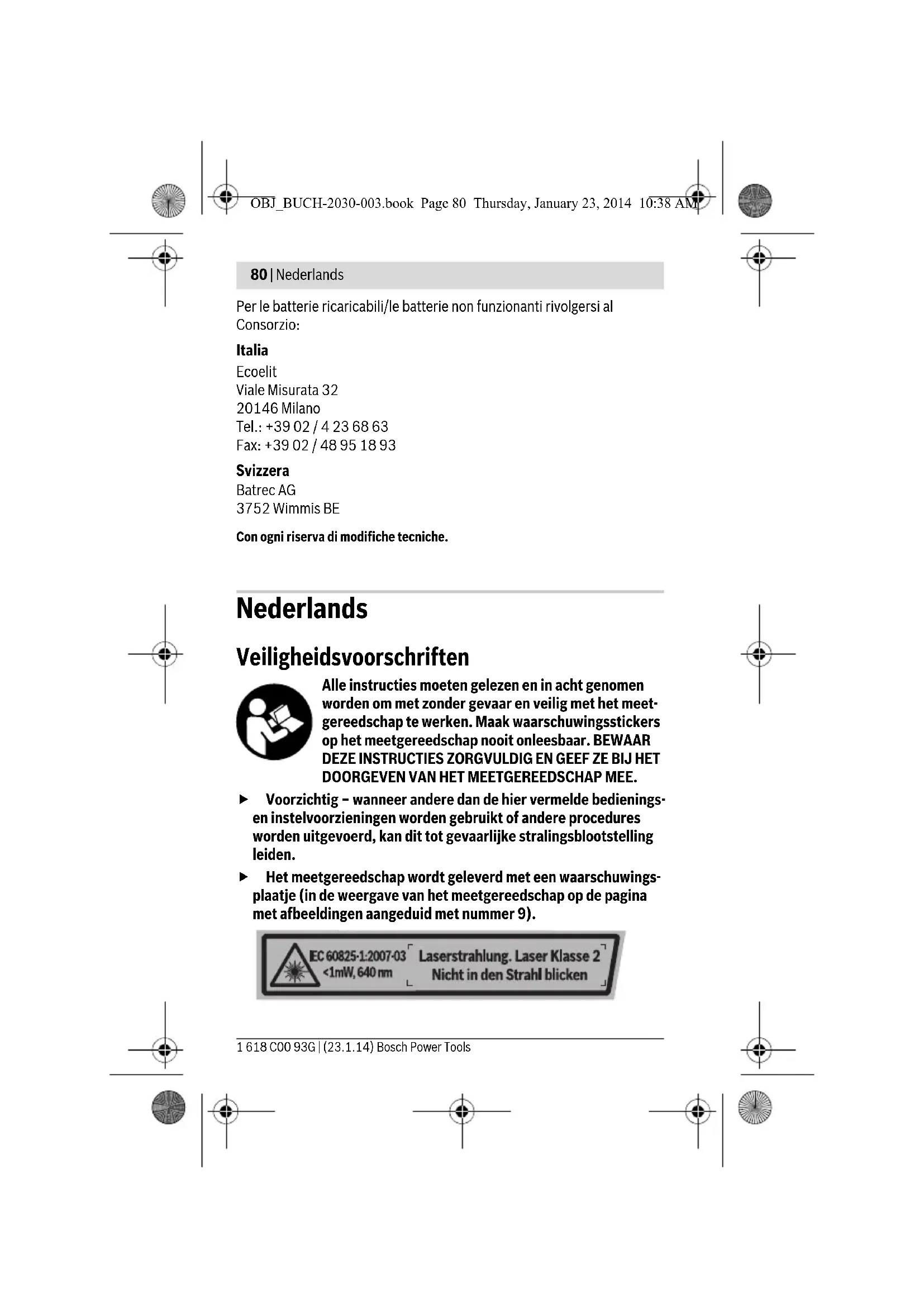 Bedrijfstemperatuur +10 °C...+40 °C Bewaartemperatuur –20 °C...+70 °C A) Na kalibratie bij 0 ° en 90 ° bij een extra stijgingsfout van max. ±0,02 ° /graden tot 90 °. B) via 25 °C graduele verslechtering Het serienummer 10 op het typeplaatje dient voor de eenduidige identificatie van uw meetgereedschap. OBJ_BUCH-2030-003.book Page 83 Thursday, January 23, 2014 10:38 AM84 | Nederlands 1 618 C00 93G | (23.1.14) Bosch Power Tools Montage Batterijen inzetten of vervangen Voor het gebruik van het meetgereedschap worden alkalimangaanbatte- rijen geadviseerd. Als u het batterijvakdeksel 7 wilt openen, drukt u op de vergrendeling 8 en klapt u het batterijvakdeksel open. Plaats de batterijen. Let daarbij op de juiste poolaansluitingen, zoals aangegeven op de binnenzijde van het bat- terijvakdeksel. Vervang altijd alle batterijen tegelijkertijd. Gebruik alleen batterijen van één fabrikant en met dezelfde capaciteit. Neem de batterijen uit het meetgereedschap als u het langdurig niet gebruikt. Als de batterijen lang worden bewaard, kunnen deze gaan roesten en leegraken. Relatieve luchtvochtigheid max. 90 % Laserklasse