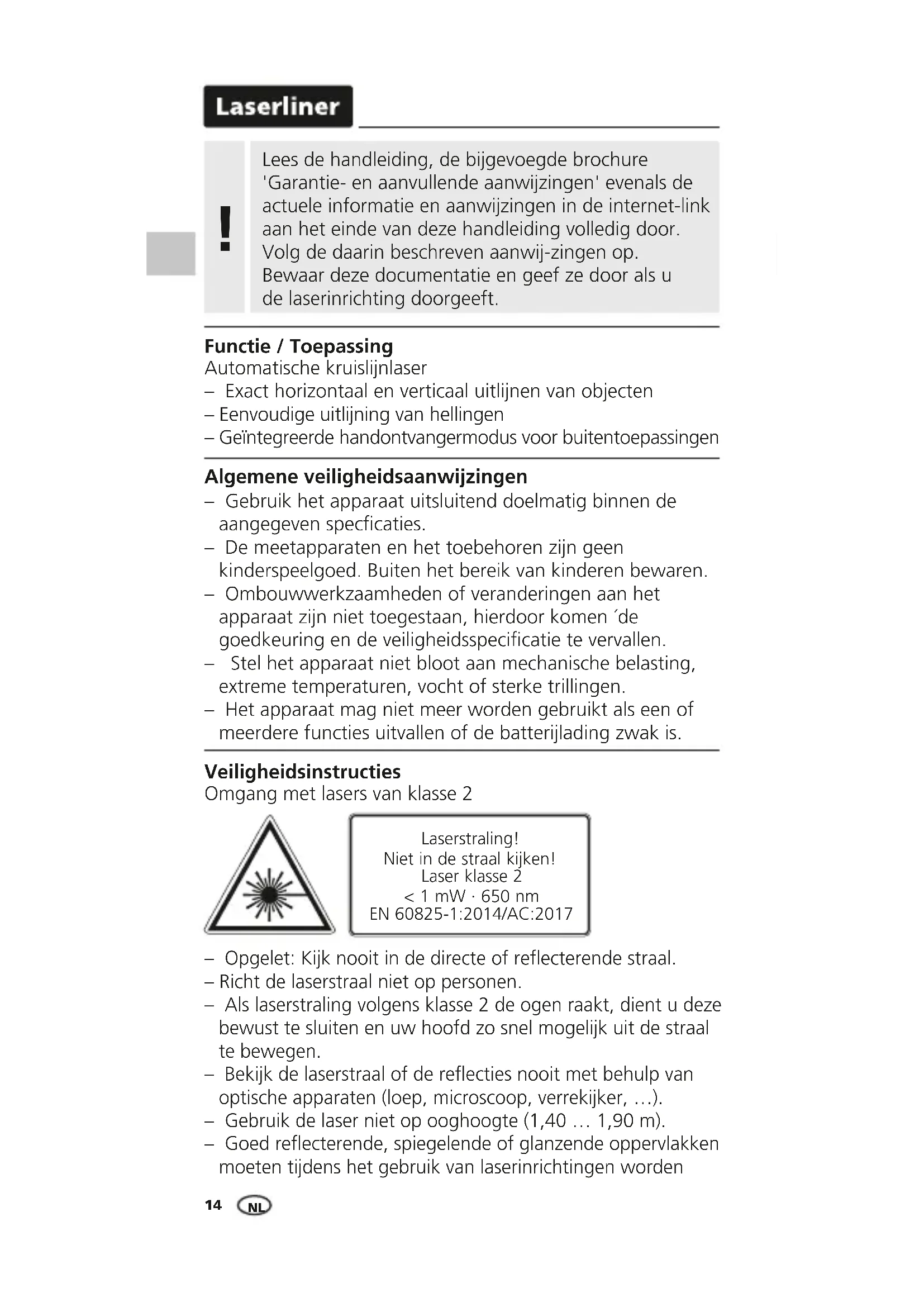 - at max. 300 lux EN14 Lees de handleiding, de bijgevoegde brochure 'Garantie- en aanvullende aanwijzingen' evenals de actuele informatie en aanwijzingen in de internet-link aan het einde van deze handleiding volledig door. Volg de daarin beschreven aanwij-zingen op. Bewaar deze documentatie en geef ze door als u de laserinrichting doorgeeft.