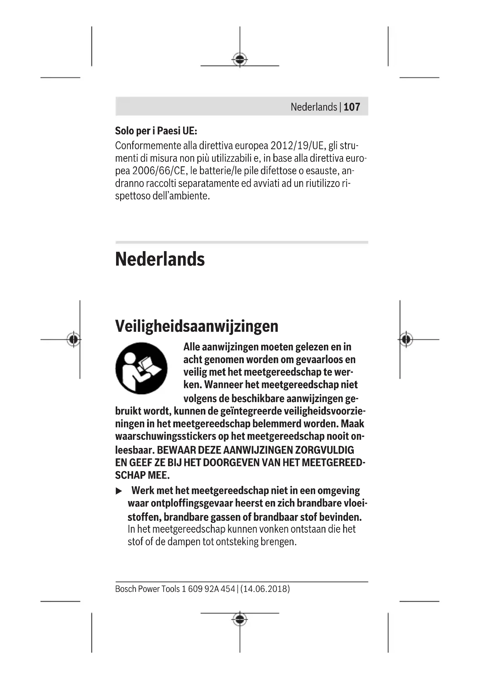 slechte meetomstandigheden Het meetbereik <20 m aan- houden en de aanwijzingen m.b.t. het meetbereik opvol- gen Adapter monteren (zie afbeeldingen E, H, J) – Verwijder de afdekkap (9) van het meetgereedschap. – Plaats de adapter zo op de afstandsmeter, dat deze ver- grendelt.– Voor demontage van de adapter drukken op de ontgrende- lingstoetsen (10) en de adapter lostrekken. – Plaats de afdekkap weer op het meetgereedschap. Digitale laser-afstandsmeter met laserlijn-adapter Gebruik Laserlijn activeren – Het meetgereedschap inschakelen (zie „Laser-afstandsme- ter in-/uitschakelen“, Pagina114). – Voor weergave van de laserlijn kort op de meettoets (1) drukken. De aanduiding knippert op het display. u Richt de laserstraal niet op personen of dieren en kijk zelf niet in de laserstraal, ook niet vanaf een grote af- stand. Opmerking: Is het meetapparaat bij het monteren van de adapter ingeschakeld, zal de laser automatisch worden uitge- schakeld. Dor het drukken op de meettoets (1) activeert u de laserlijn weer. Laserlijn uitlijnen – De laserlijn uitlijnen met de libel (12) horizontaal (zie af- beelding F) of met libel (11) verticaal (meetgereedschap 90° draaien) (zie afbeelding G). De luchtbel van de libel moet in het midden van de buislibel staan. – Voor het fijn uitlijnen van de laserlijn kunt u de adapterkop ±10° om de laserlijn draaien. Opmerking: Zorg dat het meetgereedschap altijd waterpas ligt, om een nauwkeurig meetresultaat te bereiken. De hoogte van de laserlijn aanpassen met geschikt onderlegmateriaal (bijv. ladder, boeken, etc.). Nederlands | 117 Bosch Power Tools 1 609 92A 454 | (14.06.2018)118 | Nederlands 1 609 92A 454 | (14.06.2018) Bosch Power Tools Digitale laser-afstandsmeter met band-adapter Gebruik – Het meetgereedschap inschakelen (zie „Laser-afstandsme- ter in-/uitschakelen“, Pagina114). u Gebruik de band-adapter alleen op schone, stofvrije op- pervlakken, om meetonnauwkeurigheden te voorko- men. Lengtemeting (zie afbeeldingen I1−I2) Na het inschakelen van het meetgereedschap vindt een conti- nue meting van de uitgetrokken band plaats. De actuele meet- waarde (g) wordt weergegeven in de onderste regel van het display. Tijdens de continue meting kan de lengte van de band worden gewijzigd, waarbij de actuele meetwaarde (g) in de onderste regel van het display wordt geactualiseerd. De meetprocedure wordt met een draaiende pijl op het display aangeduid. – Trek de band (13) bij de aanlegrand (14) uit de adapter en leg de band tegen het te meten object. De zichtbare lengte van de band (tussen de beide rode narkeringen) komt over- een met de meetlengte (in cm). – Druk op de meettoets (1) voor het opslaan van de meet- waarde. De actuele meetwaarde (g) wordt weergegeven in de onderste regel van het display. Druk opnieuw op de meettoets (1), om een nieuwe meting te starten. De actuele meetwaarde (g) wordt weergegeven in de onderste regel van het display, de vorige meetwaarde (e) wordt opgeslagen en wordt weergegeven in de boven- ste regel van het display. Opmerking: Bij het uitschakelen van het meetgereedschap, wordt de actuele meetwaarde (g) gereset naar "0", ook als deband nog is uitgetrokken. Om meetfouten te voorkomen, de band vóór een nieuwe meting absoluut volledig oprollen en daarna op de meettoets drukken. Is de band al volledig uitgetrokken als u de adapter op het meetgereedschap monteert of als u het meetgereedschap in- schakelt, verschijnt de aanduiding "roll in" op het display. De band volledig laten oprollen en daarna op de meettoets druk- ken, voordat u opnieuw meet. u Zorg altijd dat de meetband niet snel terugschiet in de adapter. Laat de band langzaam weer oprollen in de adap- ter, anders kan de band worden beschadigd. Oppervlaktemeting – Druk twee keer snel op de meettoets (1), om de beide laat- ste meetwaarden te vermenigvuldigen. Op het display ver- schijnt de aanduiding , de oppervlaktewaarde wordt weergegeven. Digitale laser-afstandsmeter met wiel-adapter Gebruik – Het meetgereedschap inschakelen (zie „Laser-afstandsme- ter in-/uitschakelen“, Pagina114). Lengtemeting (zie afbeeldingen K1−K2). – Met het wiel (15) het te meten traject aflopen. Na het inschakelen van het meetgereedschap vindt een continue meting door het wiel plaats. De actuele meetwaar- de (g) wordt weergegeven in de onderste regel van het dis- play. Tijdens de continue meting kan het wiel vooruit of achteruit worden gerold, de meetwaarden zijn in beide richtingen po- sitief. Bij het wisselen van de richting tijdens de meting, Nederlands | 119 Bosch Power Tools 1 609 92A 454 | (14.06.2018)120 | Nederlands 1 609 92A 454 | (14.06.2018) Bosch Power Tools wordt de waarde afgetrokken tot het nulpunt. Bij het weer passeren van het nulpunt wordt de waarde weer positief. De actuele meetwaarde (g) wordt in de onderste regel van het display geactualiseerd. – De meetprocedure wordt beëindigd, als het wiel stilstaat. De actuele meetwaarde (g) wordt weergegeven. – Druk opnieuw op de meettoets (1) om de meetwaarde op te slaan en ga verder met het meten. De actuele meetwaar- de (g) wordt weergegeven in de onderste regel van het dis- play, de vorige meetwaarde (e) daarboven. Opmerking:Om een nauwkeurig meetresultaat te bereiken, de hoek van het meetgereedschap t.o.v. het oppervlak niet wijzi- gen (zie afbeelding L). Zorg tijdens de meetprocedure voor een gelijkmatige druk. Op zachte ondergronden en/of bij een te sterke druk, kan het resultaat variëren. De aanbevolen druk voor een nauwkeurig meetresultaat is 500 g. Oppervlaktemeting – Druk twee keer snel op de meettoets (1), om de beide laat- ste meetwaarden te vermenigvuldigen. Op het display ver- schijnt de aanduiding , de oppervlaktewaarde wordt weergegeven. Onderhoud en service Onderhoud en reiniging Houd het meetgereedschap altijd schoon. Dompel het meetgereedschap niet in water of andere vloei- stoffen. Verwijder vuil met een vochtige, zachte doek. Gebruik geen reinigings- of oplosmiddelen.Vooral de