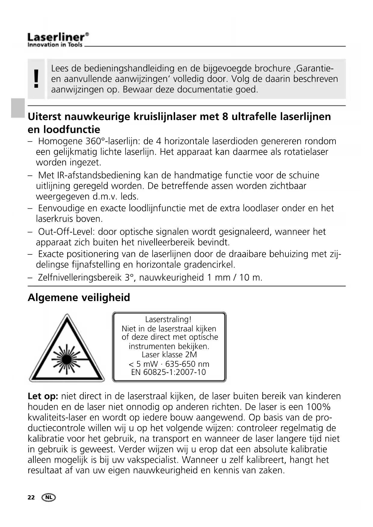 Technical data Self-levelling range 3° Precision ± 1 mm / 10 m Laser wavelength linelaser / plumb laser 635 nm / 650 nm Laser class / line laser output power 2M / < 5 mW Laser class / plumb laser output power 2 / ≤ 1 mW Power supply Lithium-ion rechargeable battery Battery operating time (all lasers on) approx. 8 h Battery recharging time approx. 6 h Weight (incl. rechargeable battery ) 1,6 kg Dimensions (W x H x D) 130 x 225 x 130 mm Operating temperature 0°C ... + 50°C Storage temperature -10°C ... + 70°C Subject to technical alterations 04/2014 Checking the vertical line: Position the device about 5 m from a wall. Fix a plumb bob with a line of 2.5 m length on the wall, making sure that the bob can swing freely. Switch on the device and align the vertical laser to the plumb line. The precision is within the specified tolerance if the deviation between the laser line and the plumb line is not greater than ± 1.5 mm. Checking the horizontal line: Position the device about 5 m from a wall and switch on the cross laser. Mark point B on the wall. Turn the laser cross approx. 2.5 m to the right and mark point C. Check whether the horizontal line from point C is level with point B to within ± 2 mm. Repeat the process by turning the laser to the left. Regularly check the adjustment before use, after transport and after extended periods of storage. !22 Uiterst nauwkeurige kruislijnlaser met 8 ultrafelle laserlijnen en loodfunctie – Homogene 360°-laserlijn: de 4 horizontale laserdioden genereren rondom een gelijkmatig lichte laserlijn. Het apparaat kan daarmee als rotatielaser worden ingezet. – Met IR-afstandsbediening kan de handmatige functie voor de schuine uitlijning geregeld worden. De betreffende assen worden zichtbaar weergegeven d.m.v. leds. – Eenvoudige en exacte loodlijnfunctie met de extra loodlaser onder en het laserkruis boven. – Out-Off-Level: door optische signalen wordt gesignaleerd, wanneer het apparaat zich buiten het nivelleerbereik bevindt. – Exacte positionering van de laserlijnen door de draaibare behuizing met zij- delingse fijnafstelling en horizontale gradencirkel. – Zelfnivelleringsbereik 3°, nauwkeurigheid 1 mm / 10 m. Algemene veiligheid Let op: niet direct in de laserstraal kijken, de laser buiten bereik van kinderen houden en de laser niet onnodig op anderen richten. De laser is een 100% kwaliteits-laser en wordt op iedere bouw aangewend. Op basis van de pro- ductiecontrole willen wij u op het volgende wijzen: controleer regelmatig de kalibratie voor het gebruik, na transport en wanneer de laser langere tijd niet in gebruik is geweest. Verder wijzen wij u erop dat een absolute kalibratie alleen mogelijk is bij uw vakspecialist. Wanneer u zelf kalibreert, hangt het resultaat af van uw eigen nauwkeurigheid en kennis van zaken. Laserstraling! Niet in de laserstraal kijken of deze direct met optische instrumenten bekijken. Laser klasse 2M < 5 mW · 635-650 nm EN 60825-1:2007-10 Lees de bedieningshandleiding en de bijgevoegde brochure ‚Garantie- en aanvullende aanwijzingen‘ volledig door. Volg de daarin beschreven aanwijzingen op. Bewaar deze documentatie goed.