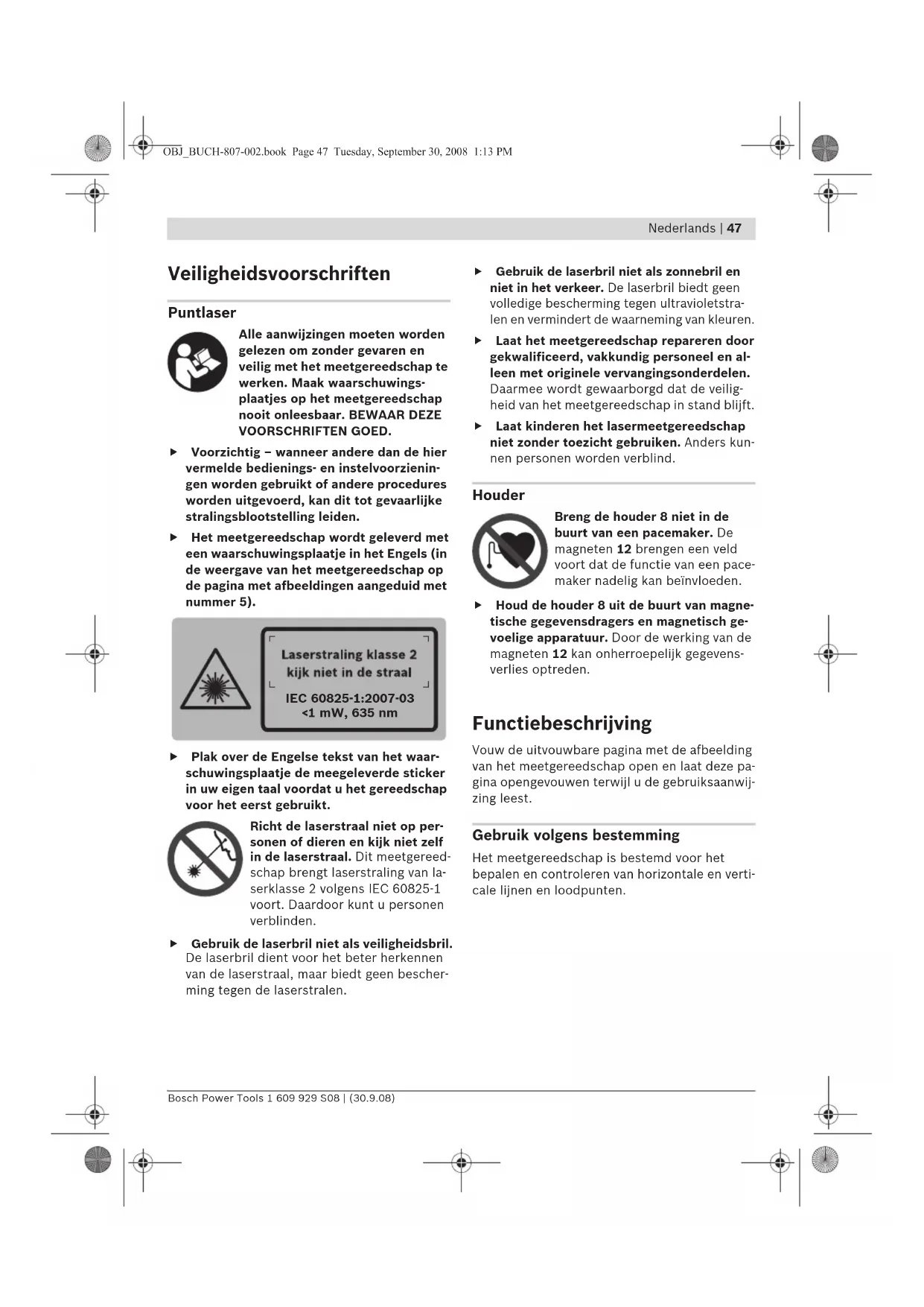 Veiligheidsvoorschriften Puntlaser Alle aanwijzingen moeten worden gelezen om zonder gevaren en veilig met het meetgereedschap te werken. Maak waarschuwings- plaatjes op het meetgereedschap nooit onleesbaar. BEWAAR DEZE VOORSCHRIFTEN GOED. f Voorzichtig – wanneer andere dan de hier vermelde bedienings- en instelvoorzienin- gen worden gebruikt of andere procedures worden uitgevoerd, kan dit tot gevaarlijke stralingsblootstelling leiden. f Het meetgereedschap wordt geleverd met een waarschuwingsplaatje in het Engels (in de weergave van het meetgereedschap op de pagina met afbeeldingen aangeduid met nummer 5). f Plak over de Engelse tekst van het waar- schuwingsplaatje de meegeleverde sticker in uw eigen taal voordat u het gereedschap voor het eerst gebruikt. Richt de laserstraal niet op per- sonen of dieren en kijk niet zelf in de laserstraal. Dit meetgereed- schap brengt laserstraling van la- serklasse 2 volgens IEC 60825-1 voort. Daardoor kunt u personen verblinden. f Gebruik de laserbril niet als veiligheidsbril. De laserbril dient voor het beter herkennen van de laserstraal, maar biedt geen bescher- ming tegen de laserstralen. f Gebruik de laserbril niet als zonnebril en niet in het verkeer. De laserbril biedt geen volledige bescherming tegen ultravioletstra- len en vermindert de waarneming van kleuren. f Laat het meetgereedschap repareren door gekwalificeerd, vakkundig personeel en al- leen met originele vervangingsonderdelen. Daarmee wordt gewaarborgd dat de veilig- heid van het meetgereedschap in stand blijft. f Laat kinderen het lasermeetgereedschap niet zonder toezicht gebruiken. Anders kun- nen personen worden verblind. Houder Breng de houder 8 niet in de buurt van een pacemaker. De magneten 12 brengen een veld voort dat de functie van een pace- maker nadelig kan beïnvloeden. f Houd de houder 8 uit de buurt van magne- tische gegevensdragers en magnetisch ge- voelige apparatuur. Door de werking van de magneten 12 kan onherroepelijk gegevens- verlies optreden. Functiebeschrijving Vouw de uitvouwbare pagina met de afbeelding van het meetgereedschap open en laat deze pa- gina opengevouwen terwijl u de gebruiksaanwij- zing leest. Gebruik volgens bestemming Het meetgereedschap is bestemd voor het bepalen en controleren van horizontale en verti- cale lijnen en loodpunten.
