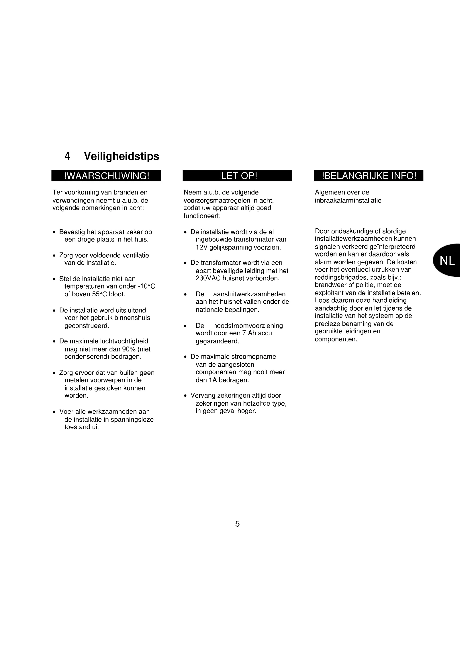 Door ondeskundige of slordige installatiewerkzaamheden kunnen signalen verkeerd geïnterpreteerd worden en kan er daardoor vals alarm worden gegeven. De kosten voor het eventueel uitrukken van reddingsbrigades, zoals bijv.: brandweer of politie, moet de exploitant van de installatie betalen. Lees daarom deze handleiding aandachtig door en let tijdens de installatie van het systeem op de precieze benaming van de gebruikte leidingen en componenten.6