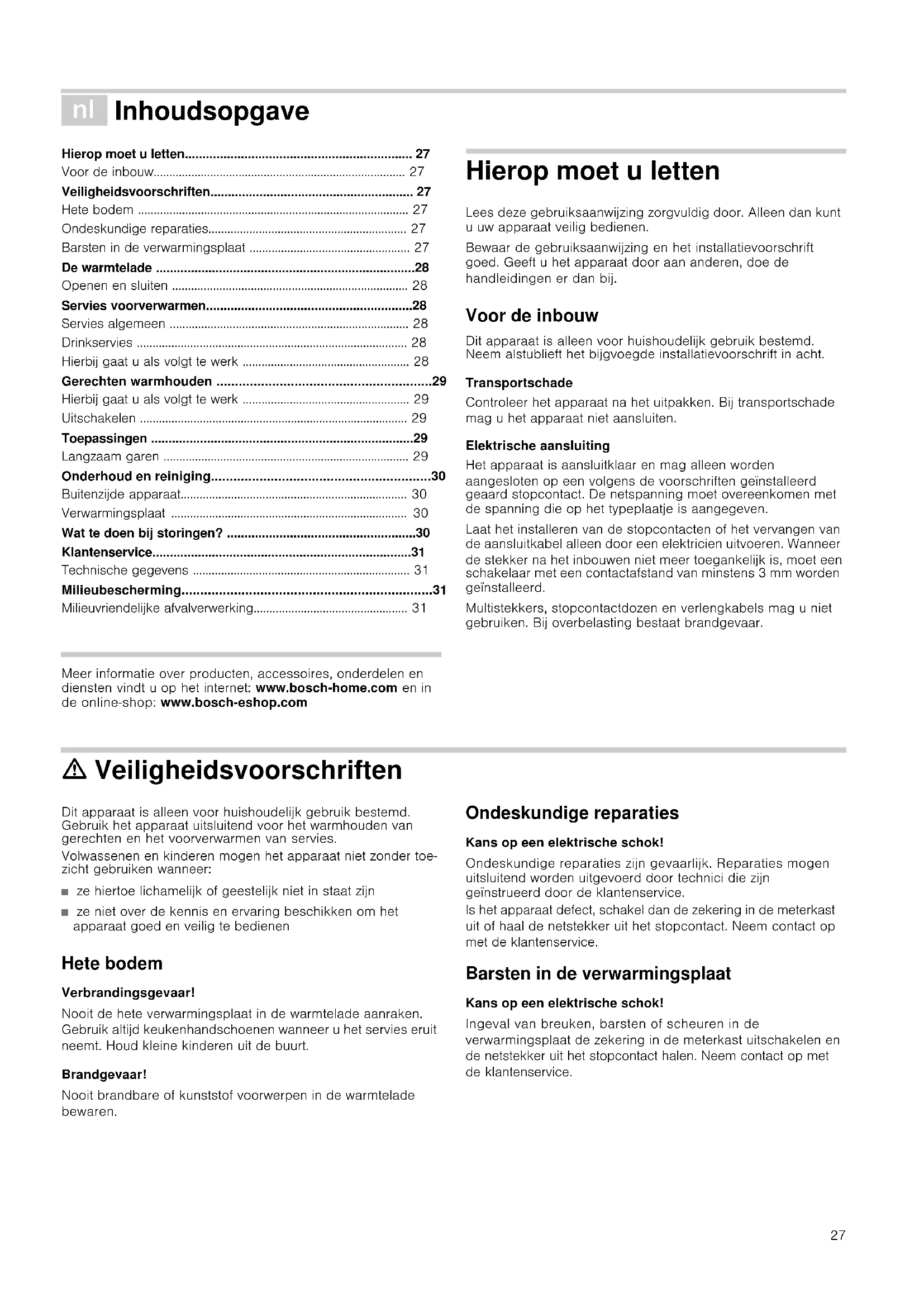 - Milieuvriendelijke afvalverwerking Produktinfo Meer informatie over producten, accessoires, onderdelen en diensten vindt u op het internet: www.bosch-home.com en in de online-shop: www.bosch-eshop.com Hierop moet u letten Lees deze gebruiksaanwijzing zorgvuldig door. Alleen dan kunt u uw apparaat veilig bedienen. Bewaar de gebruiksaanwijzing en het installatievoorschrift goed. Geeft u het apparaat door aan anderen, doe de handleidingen er dan bij. Voor de inbouw Dit apparaat is alleen voor huishoudelijk gebruik bestemd. Neem alstublieft het bijgvoegde installatievoorschrift in acht. Transportschade Controleer het apparaat na het uitpakken. Bij transportschade mag u het apparaat niet aansluiten. Elektrische aansluiting Het apparaat is aansluitklaar en mag alleen worden aangesloten op een volgens de voorschriften geïnstalleerd geaard stopcontact. De netspanning moet overeenkomen met de spanning die op het typeplaatje is aangegeven. Laat het installeren van de stopcontacten of het vervangen van de aansluitkabel alleen door een elektricien uitvoeren. Wanneer de stekker na het inbouwen niet meer toegankelijk is, moet een schakelaar met een contactafstand van minstens 3 mm worden geïnstalleerd. Multistekkers, stopcontactdozen en verlengkabels mag u niet gebruiken. Bij overbelasting bestaat brandgevaar. ã=Veiligheidsvoorschriften Dit apparaat is alleen voor huishoudelijk gebruik bestemd. Gebruik het apparaat uitsluitend voor het warmhouden van gerechten en het voorverwarmen van servies. Volwassenen en kinderen mogen het apparaat niet zonder toe- zicht gebruiken wanneer: ■ ze hiertoe lichamelijk of geestelijk niet in staat zijn ■ ze niet over de kennis en ervaring beschikken om het apparaat goed en veilig te bedienen Hete bodem Verbrandingsgevaar! Nooit de hete verwarmingsplaat in de warmtelade aanraken. Gebruik altijd keukenhandschoenen wanneer u het servies eruit neemt. Houd kleine kinderen uit de buurt. Brandgevaar! Nooit brandbare of kunststof voorwerpen in de warmtelade bewaren. Ondeskundige reparaties Kans op een elektrische schok! Ondeskundige reparaties zijn gevaarlijk. Reparaties mogen uitsluitend worden uitgevoerd door technici die zijn geïnstrueerd door de klantenservice. Is het apparaat defect, schakel dan de zekering in de meterkast uit of haal de netstekker uit het stopcontact. Neem contact op met de klantenservice. Barsten in de verwarmingsplaat Kans op een elektrische schok! Ingeval van breuken, barsten of scheuren in de verwarmingsplaat de zekering in de meterkast uitschakelen en de netstekker uit het stopcontact halen. Neem contact op met de klantenservice.28 De warmtelade In de warmtelade kunt u servies voorverwarmen of gerechten warmhouden. Het apparaat warmt alleen op wanneer de lade goed gesloten is. Openen en sluiten Bij apparaten zonder handgreep: Om de lade te openen of te sluiten drukt u op het midden ervan. Bij het openen springt de lade gemakkelijk naar buiten. Hierna kan hij er probleemloos worden uitgetrokken. Servies voorverwarmen In voorverwarmd servies koelen de gerechten niet zo snel af. Dranken blijven langer warm. Servies algemeen U mag de warmtelade met maximaal 25 kg belasten. U kunt bijv. servies voor een menu voor 6 of 12 personen voorverwarmen. Servies inruimen Verdeel het servies zo mogelijk over het hele oppervlak. Hoge stapels borden worden langzamer warm dan afzonderlijke delen van een servies, zoals bijv. 2 schalen. Drinkservies Verwarm drinkservies, zoals bijv. espressokoppen, altijd op stand 2. ã=Verbrandingsgevaar! Bij stand 3 of 4 worden de vormen heel heet. Hierbij gaat u als volgt te werk 1.Servies opbergen in de lade.2.De functiekeuzeknop op stand 4 zetten. Kies voor drinkservies altijd stand 2. Het bedrijfsindicatielampje brandt. 3.Warmtelade sluiten. Het bedrijfsindicatielampje brandt. Het apparaat warmt op. Hoe lang duurt het voorverwarmen? De duur van het voorverwarmen hangt af van het materiaal en de dikte, de hoeveelheid, de hoogte en de plaatsing van het servies. Verdeel het servies zo mogelijk over het hele oppervlak. Bij menuservies voor 6 personen duurt het voorverwarmen ongeveer 15-25 minuten. Uitschakelen Open de lade. Schakel de functiekeuzeknop uit. Het servies uit de lade nemen Neem het servies met een keukenhandschoen of een pannenlap uit de lade. ã=Verbrandingsgevaar! Het oppervlak van de verwarmingsplaat is heet. De onderste delen van het servies worden heter dan de bovenste. %HGULMIVLQGLFDWLHODPSMH $OVXKHWDSSDUDDWLQVFKDNHOW NQLSSHUWKHWLQGLFDWLHODPSMH 1DKHWVOXLWHQEUDQGWKHW 'HYHQWLODWRUHQGHYHUZDUPLQJ ORSHQELMGHVWDQG 6HUYLHVYRRUYHUZDUPHQ DQ 9HUZDUPLQJVSODDW )XQFWLHNHX]HNQRS 8LW p. 31