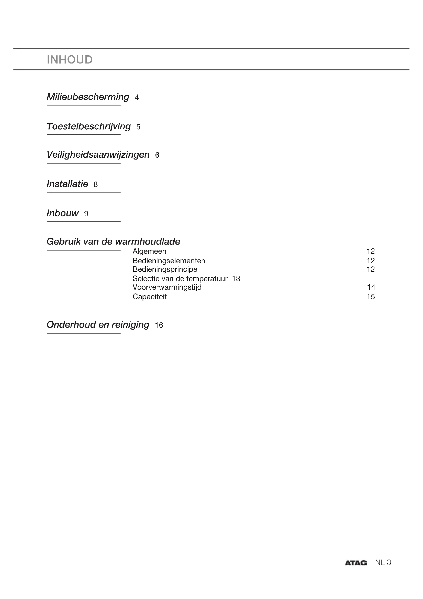 Manual EN 3 - EN 16 Gebruikte pictogrammen - Pictogrammes utilisés Benutzte Piktogramme - Pictograms used Belangrijk om te weten - Important à savoir Wissenswertes - Important information Tip - Conseil - Tipp - TipNL 3 INHOUD Milieubescherming 4 Toestelbeschrijving 5 Veiligheidsaanwijzingen 6 Installatie 8 Inbouw 9 Gebruik van de warmhoudlade Algemeen 12 Bedieningselementen 12 Bedieningsprincipe 12 Selectie van de temperatuur 13 Voorverwarmingstijd 14 Capaciteit 15 Onderhoud en reiniging 16NL 4 MIlIeUbescHerMINg De verpakkingsmaterialen van dit toestel kunnen gerecycled worden. Doe dit a.u.b. en draag zo bij tot de bescherming van het milieu door ze in de passende container of afvalzak te gooien. Vernietiging van oude elektrische apparaten De Europese Richtlijn 2012/19/EC over Vernietiging van Elektrische en Elektronische Apparatuur (WEEE), vereist dat oude huishoudelijke elektrische apparaten niet mogen vernietigd via de normale ongesorteerde afvalstroom. Oude apparaten moeten apart worden ingezameld om zo het hergebruik van de gebruikte materialen te optimaliseren en de negatieve invloed op de gezondheid en het milieu te reduceren. Het symbool op het product van de “afvalcontainer met een kruis erdoor” herinnert u aan uw verplichting, dat wanneer u het apparaat vernietigt, het apparaat apart moet worden ingezameld. Consumenten moeten contact opnemen met de locale autoriteiten voor informatie over de juiste wijze van vernietiging van hun oude apparaat.NL 5 tOestelbescHrIjvINg
