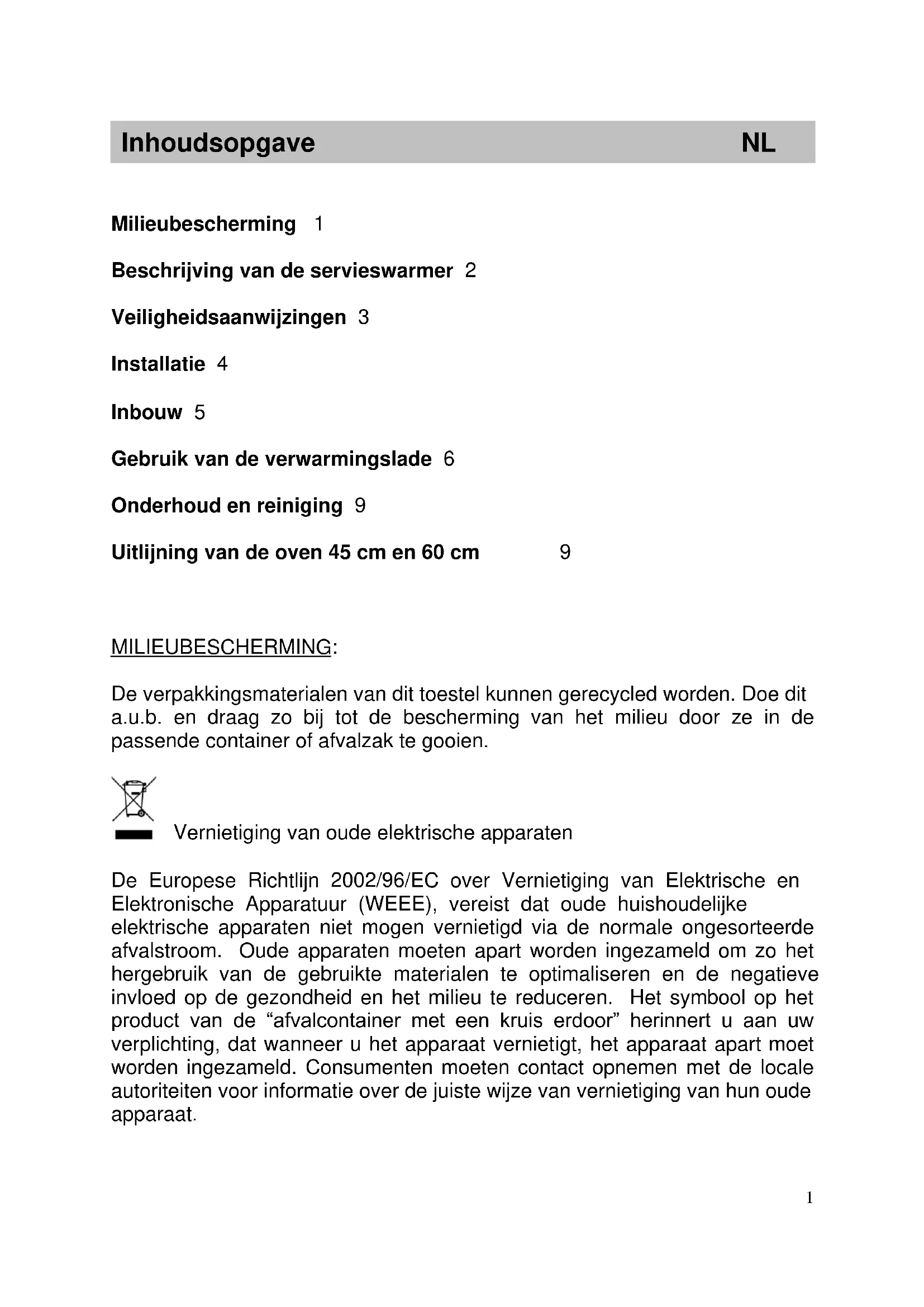 Milieubescherming 1 Beschrijving van de servieswarmer 2 Veiligheidsaanwijzingen 3 Installatie 4 Inbouw 5 Gebruik van de verwarmingslade 6 Onderhoud en reiniging 9 Uitlijning van de oven 45 cm en 60 cm 9