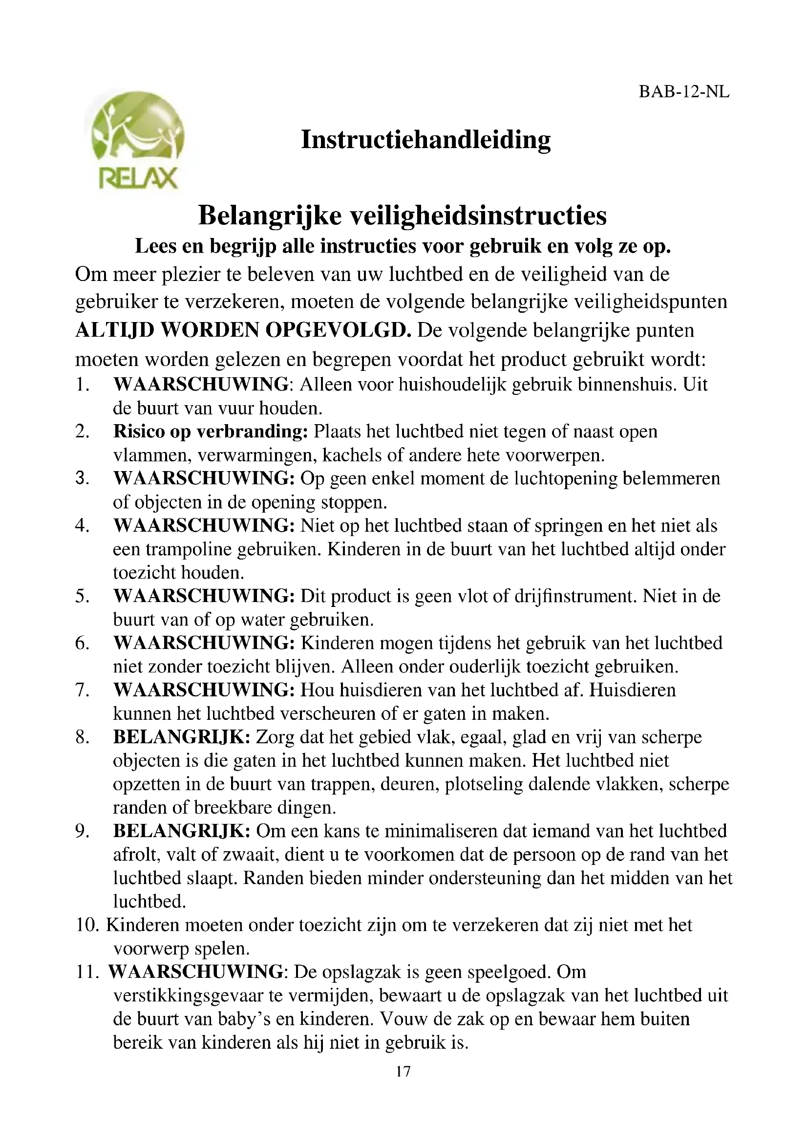 verstikkingsgevaar te vermijden, bewaart u de opslagzak van het luchtbed uit de buurt van baby’s en kinderen. Vouw de zak op en bewaar hem buiten bereik van kinderen als hij niet in gebruik is. Instructiehandleiding BAB-12-NL18