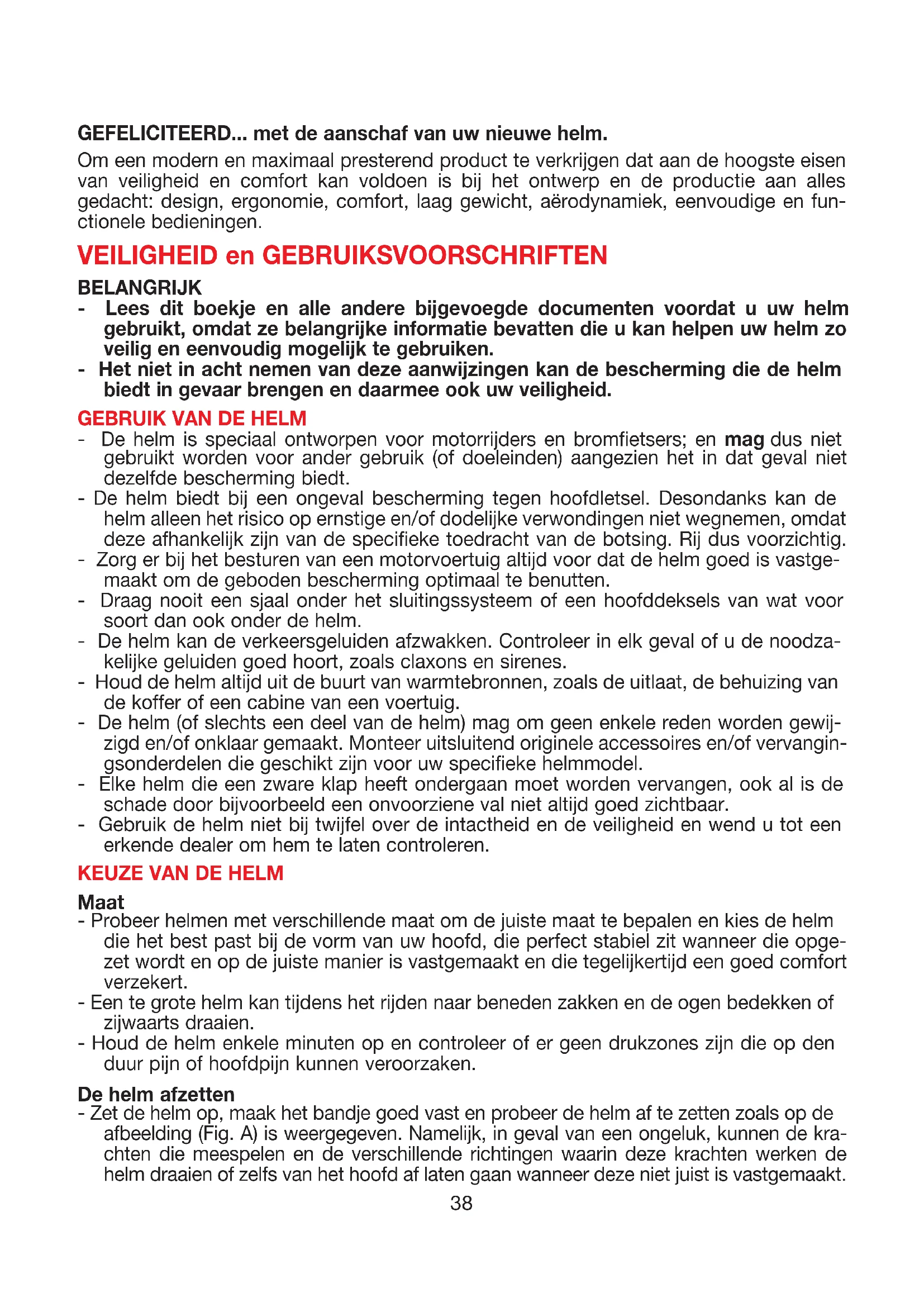Maat - Probeer helmen met verschillende maat om de juiste maat te bepalen en kies de helm die het best past bij de vorm van uw hoofd, die perfect stabiel zit wanneer die opge- zet wordt en op de juiste manier is vastgemaakt en die tegelijkertijd een goed comfort verzekert. - Een te grote helm kan tijdens het rijden naar beneden zakken en de ogen bedekken of zijwaarts draaien. - Houd de helm enkele minuten op en controleer of er geen drukzones zijn die op den duur pijn of hoofdpijn kunnen veroorzaken. De helm afzetten - Zet de helm op, maak het bandje goed vast en probeer de helm af te zetten zoals op de afbeelding (Fig. A) is weergegeven. Namelijk, in geval van een ongeluk, kunnen de kra- chten die meespelen en de verschillende richtingen waarin deze krachten werken de helm draaien of zelfs van het hoofd af laten gaan wanneer deze niet juist is vastgemaakt.