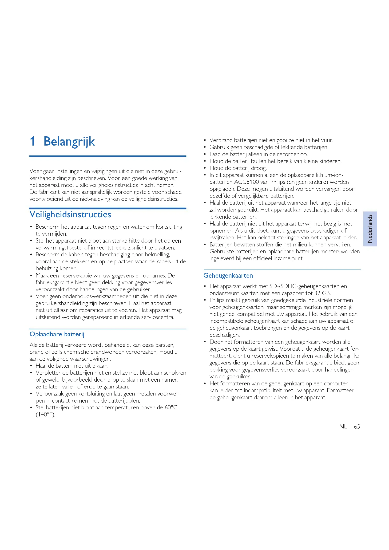 - In dit apparaat kunnen alleen de oplaadbare lithium-ion- batterijen ACC8100 van Philips (en geen andere) worden opgeladen. Deze mogen uitsluitend worden vervangen door dezelfde of vergelijkbare batterijen.