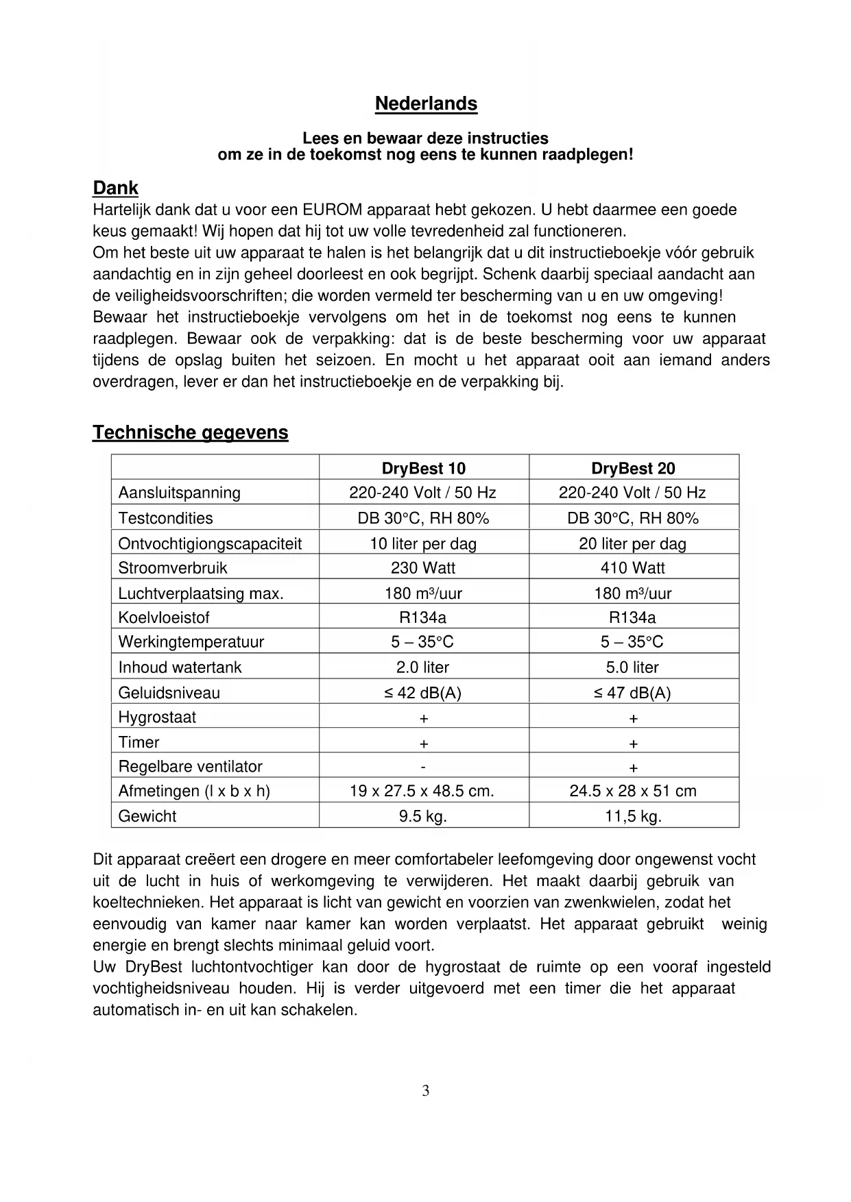 Dit apparaat creëert een drogere en meer comfortabeler leefomgeving door ongewenst vocht uit de lucht in huis of werkomgeving te verwijderen. Het maakt daarbij gebruik van koeltechnieken. Het apparaat is licht van gewicht en voorzien van zwenkwielen, zodat het eenvoudig van kamer naar kamer kan worden verplaatst. Het apparaat gebruikt weinig energie en brengt slechts minimaal geluid voort. Uw DryBest luchtontvochtiger kan door de hygrostaat de ruimte op een vooraf ingesteld vochtigheidsniveau houden. Hij is verder uitgevoerd met een timer die het apparaat automatisch in- en uit kan schakelen.4 Waarschuwingen voor gebruik Uitsluitend geschikt voor gebruik binnenshuis. Houd het apparaat altijd rechtop in verticale stand. Als het apparaat niet stabiel rechtop staat kan er water vanuit de tank in het binnenwerk terechtkomen en daar schade aanrichten of een gevaarlijke situatie veroorzaken! Voordat u de luchtontvochtiger verplaatst, reinigt of er onderhoud aan uitvoert dient u hem éérst uit te schakelen, de stekker uit het stopcontact te nemen en de watertank leeg te maken. Pak de stekker daartoe in de hand; trek nooit aan het koord! Laat het apparaat na transport of overhellen (max. 45°, bijv. tijdens reiniging) altijd een uur rusten voor u de stroom weer aansluit. Zorg ervoor dat de luchtinvoer- en uitlaatopeningen altijd vrij zijn van blokkades en vuil. Voorkom dat vreemde voorwerpen of vingers door de ventilatie- of uitblaasopeningen de kachel binnendringen. Dit kan een elektrische schok, brand of beschadiging veroorzaken. Aansluitspanning en frequentie, vermeld op het apparaat, dienen overeen te komen met die van het te gebruiken stopcontact. De elektrische installatie dient beveiligd te zijn met een aardlekschakelaar (max. 30 mAmp.). Sluit het apparaat uitsluitend aan op een geaard stopcontact! Rol de elektrokabel volledig af voor u de stekker in het stopcontact steekt. Leid de kabel niet onder tapijt door, bedek hem niet met matten, lopertjes o.i.d. en houd de kabel buiten de looproute. Zorg ervoor dat de kabel niet heet wordt, er niet op getrapt wordt en er geen meubels op worden gezet. Leid de kabel niet om scherpe hoeken en wind hem na gebruik niet te strak op! Als het elektriciteitssnoer is beschadigd dient het, om gevaarlijke situaties te voorkomen, door een gekwalificeerd elektricien te worden vervangen. Gebruik nooit de stekker om het apparaat in- en uit te schakelen. Gebruik daarvoor de schakelaar op het controlepaneel. Gebruik geen agressieve schoonmaakmiddelen of bijv. insectenspray op de omkasting. Stel het apparaat niet bloot aan de invloed van chemicaliën. Giet of spuit nooit water over het apparaat. Dompel het apparaat niet onder water en plaats het niet in de onmiddelijke nabijheid van water of kranen o.i.d. Plaats het apparaat niet in de nabijheid licht-ontvlambare en/of gevaarlijke stoffen. Ga niet op het apparaat staan of zitten en zet er niets bovenop. Verwijder het water dat zich in het reservoir heeft verzameld regelmatig en op de voorgeschreven wijze. Gebruik het apparaat niet in een te kleine, afgesloten ruimte als een toilet o.i.d.; dat kan brand veroorzaken. Stel het apparaat niet in werking wanneer u beschadigingen constateert aan apparaat, elektrokabel of stekker, of wanneer het slecht functioneert, is gevallen of op andere wijze een storing vertoont. Neem onmiddellijk de stekker uit het stopcontact en breng het complete apparaat terug naar uw leverancier of een erkend elektricien voor controle en/of reparatie. Vraag altijd om originele onderdelen. Dit apparaat is niet geschikt om te worden gebruikt door personen (incl. kinderen) met een fysieke- zintuiglijke- of mentale beperking, of gebrek aan ervaring en kennis, ongeacht of er toezicht is of instructie is gegeven aangaande het gebruik van het apparaat door een persoon die verantwoordelijk is voor hun veiligheid. Er dient op te worden toegezien dat kinderen niet met het apparaat spelen. Wanneer de temperatuur lager dan 10°C is en de luchtvochtigheid is vrij laag, is het niet nodig te ontvochtigen. BELANGRIJK! Gebruik de luchtontvochtiger niet wanneer de temperatuur lager dan 5°C is. Erkan dan ijsafzetting ontstaan op de verdamper! Het apparaat (incl. elektrokabel en stekker) mag uitsluitend worden geopend en/of gerepareerd door daartoe bevoegde en gekwalificeerde personen.5 Beschrijving