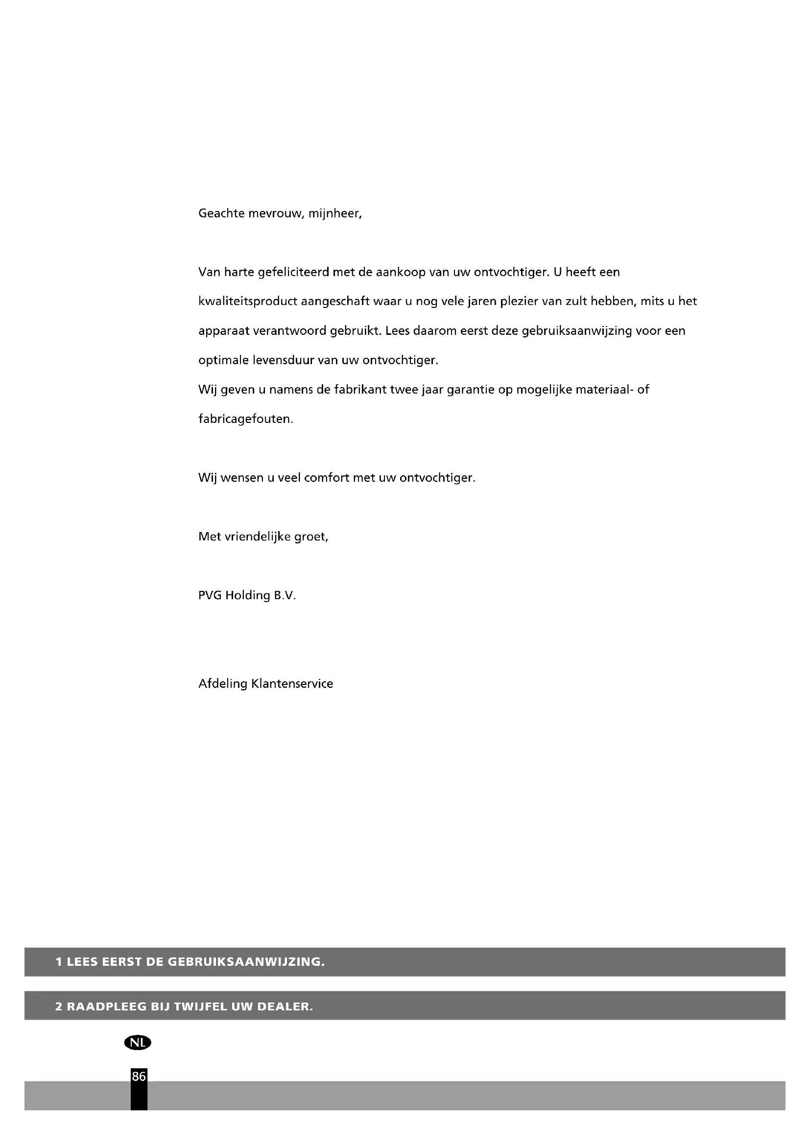 Geachte mevrouw, mijnheer, Van harte gefeliciteerd met de aankoop van uw ontvochtiger. U heeft een kwaliteitsproduct aangeschaft waar u nog vele jaren plezier van zult hebben, mits u het apparaat verantwoord gebruikt. Lees daarom eerst deze gebruiksaanwijzing voor een optimale levensduur van uw ontvochtiger. Wij geven u namens de fabrikant twee jaar garantie op mogelijke materiaal- of fabricagefouten. Wij wensen u veel comfort met uw ontvochtiger. Met vriendelijke groet, PVG Holding B.V. Afdeling KlantenserviceBELANGRIJKE ONDERDELEN Controlelampjes Regelknop/ hygrostaat Uitlaat van droge lucht Uitneembaar waterreservoir Inlaat van vochtige lucht Luchtfilter Afvoertuit (ø 13 mm) met dop Stekker en snoer Handvat
