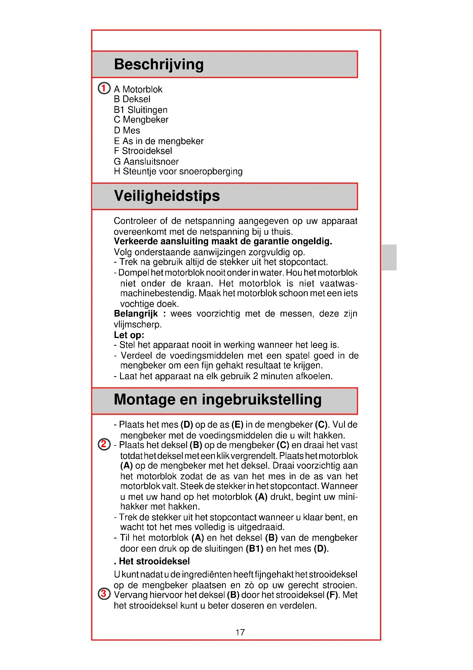 . Gebruik de fijne gaatjes voor: biscuit, noten, suiker, zout en peper. . Gebruik de grove gaten voor: peterselie, eigeel, knoflook, ham. Ingrédiënten Maximum Maximum hoeveelheid Tijd Peterselie 5 gr 15 sec. Uien 50 gr 10 sec. (puls) Sjalotjes 50 gr 10 sec. (puls) Knoflook 30 gr 10 sec. (puls- Biscuit 10 gr 15 sec. Amandelen 50 gr 15 sec. Hazelnoten 50 gr 15 sec. Noten 50 gr 15 sec. Kaas 50 gr 15 sec. Hardgekookt ei eigeel v. 2 eieren 5 sec. (puls) Ham 50 gr 15 sec. Vlees (voor tartaar) 50 gr 15 sec. Zelf mayonaise maken? Ga als volgt te werk: Ingrediënten: 1 eigeel, 1 (volle) theelepel mosterd, 1 eetlepel water, 1 theelepel azijn, 100 ml olie, zout, peper. - Doe alle ingrediënten (m.u.v. de olie) in de mengbeker. Voeg 1 eetlepel olie toe. - Meng de ingrediënten gedurende 20 seconden. - Voeg de rest van de olie toe en meng het geheel gedurende 40 seconden. Het is belangrijk dat alle ingrediënten op dezelfde temperatuur zijn. Opbergen Na gebruik kunt u het snoer (G) van uw mini-hakker om het motorblok wikkelen. Het snoer blijft op zijn plaats door het steuntje (H) dat hiervoor dient. Onderhoud Onderdelen en accessoires zijn verkrijgbaar bij uw winkelier of het Moulinex Service-centre (voor adressen zie het boekje «Moulinex Service»). Belangrijk: indien het aansluitsnoer dusdanig beschadigd is dat het vervangen dient te worden, laat het dan nakijken door een door Moulinex erkende reparateur of door de reparatie- service van Moulinex zelf daar speciaal gereedschap noodzakelijk is.19 Dit logo wijst u op de aanwezigheid van een Moulinex service- punt. Hier kunt u terecht voor: - Reparatie en controle van uw Moulinex apparaat dat al dan niet onder de garantievoorwaarden valt. - Aanschaf van onderdelen en accessoires - Tips voor gebruik en onderhoud. Garantie U heeft een garantie van één jaar op onderdelen en reparatie van uw Moulinex-apparaat. Raadpleeg het Moulinex Service boekje voor uitvoerige garantievoorwaarden. Service Wanneer het apparaat niet werkt, kunt u drie dingen doen: