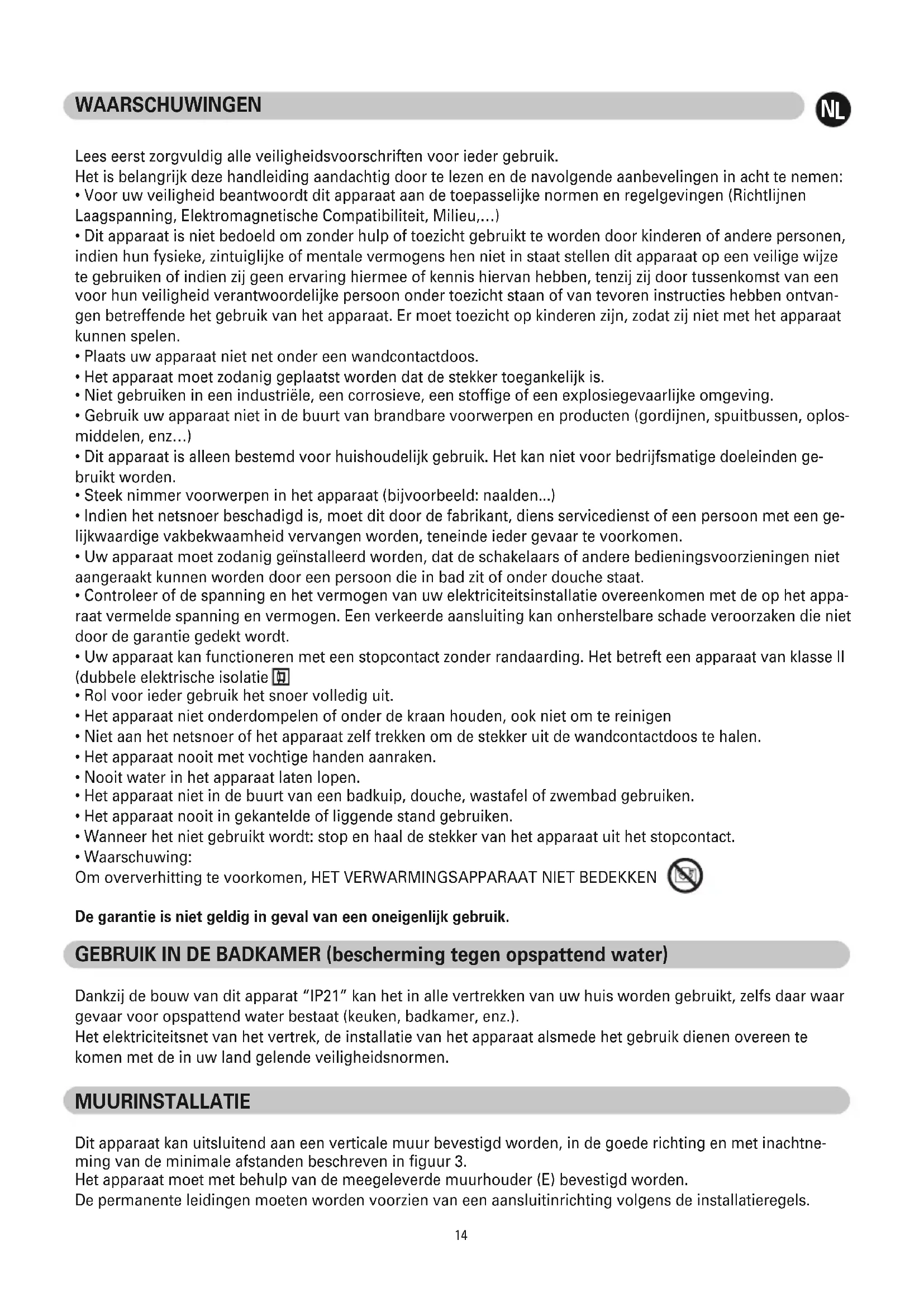 - Waarschuwing: Om oververhitting te voorkomen, HET VERWARMINGSAPPARAAT NIET BEDEKKEN De garantie is niet geldig in geval van een oneigenlijk gebruik. GEBRUIK IN DE BADKAMER (bescherming tegen opspattend water) Dankzij de bouw van dit apparat “IP21” kan het in alle vertrekken van uw huis worden gebruikt, zelfs daar waar gevaar voor opspattend water bestaat (keuken, badkamer, enz.). Het elektriciteitsnet van het vertrek, de installatie van het apparaat alsmede het gebruik dienen overeen te komen met de in uw land gelende veiligheidsnormen. MUURINSTALLATIE Dit apparaat kan uitsluitend aan een verticale muur bevestigd worden, in de goede richting en met inachtne- ming van de minimale afstanden beschreven in figuur 3. Het apparaat moet met behulp van de meegeleverde muurhouder (E) bevestigd worden. De permanente leidingen moeten worden voorzien van een aansluitinrichting volgens de installatieregels.