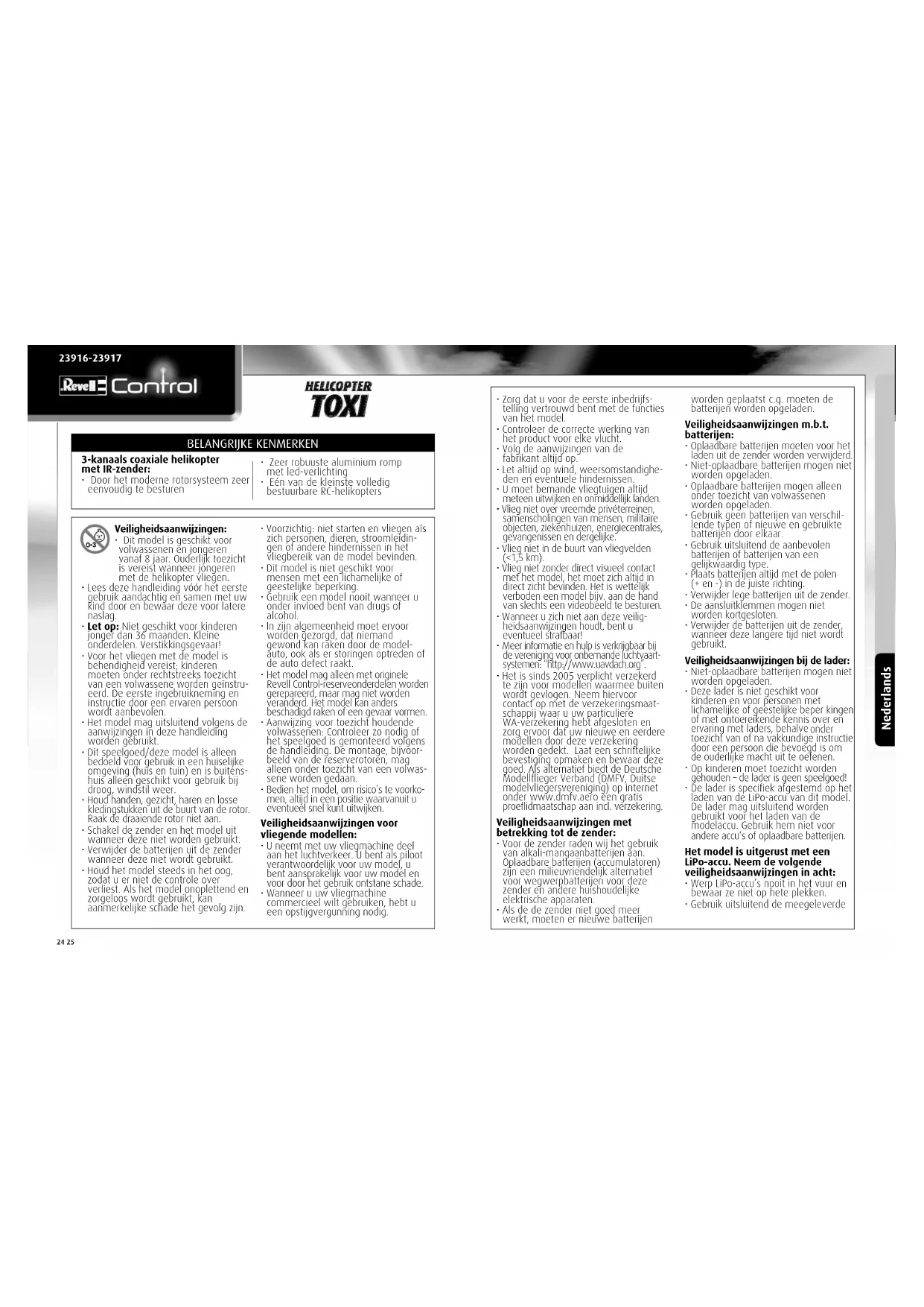 In zijn algemeenheid moet evoor worden gezord, dat niemand gewond kan teken door de modelauto, ook als er storingen optreden of de auto detect raekt. - Het model mag alleen met originee Revell Control-reserveonderden worden gerepareerd, maar mag Niet worden veranderd. Het model kan anders beschadig taken of een geleaar vormen.