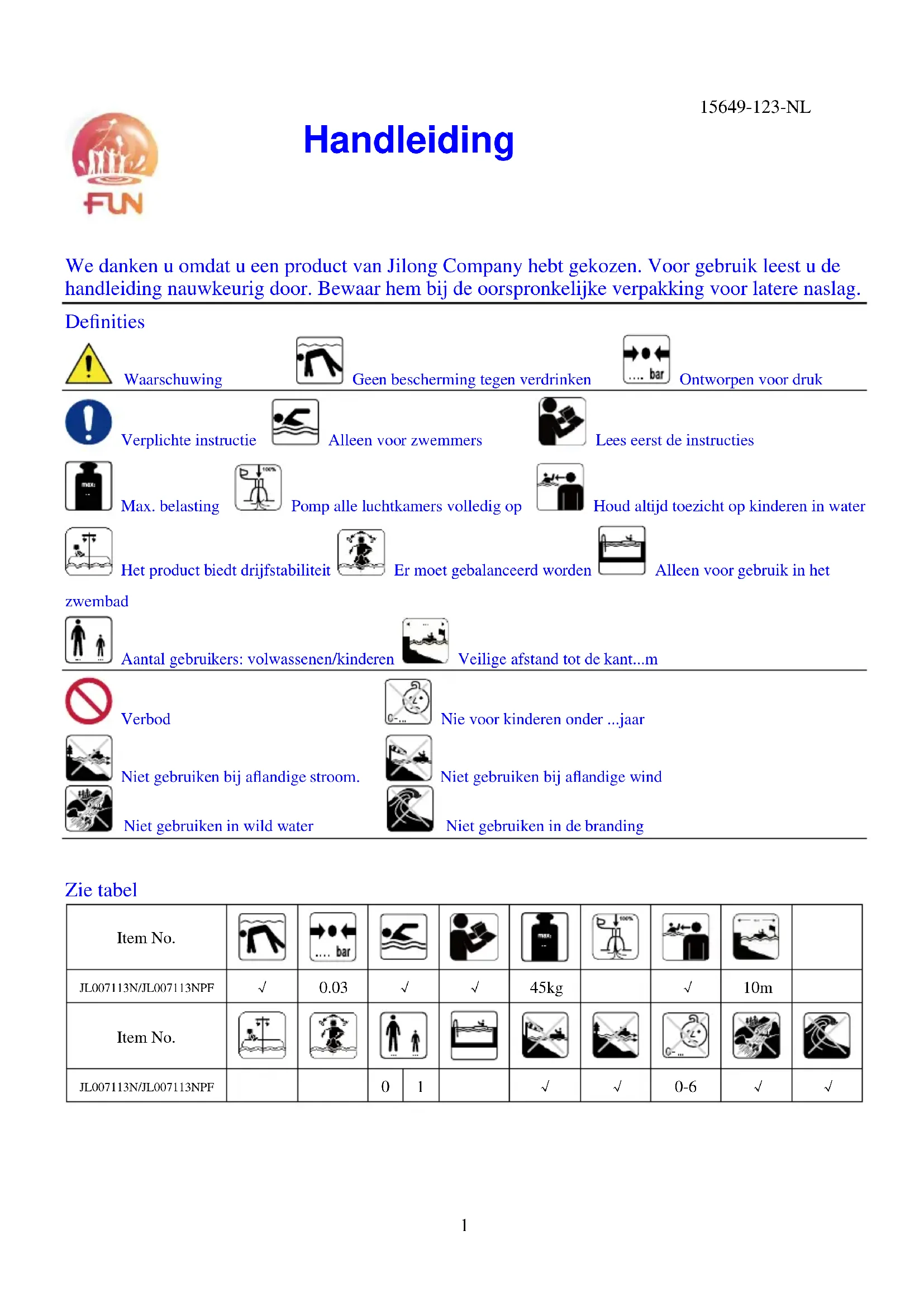 We danken u omdat u een product van Jilong Company hebt gekozen. Voor gebruik leest u de handleiding nauwkeurig door. Bewaar hem bij de oorspronkelijke verpakking voor latere naslag. Definities Waarschuwing Geen bescherming tegen verdrinken Ontworpen voor druk Verplichte instructie Alleen voor zwemmers Lees eerst de instructies Max. belasting Pomp alle luchtkamers volledig op Houd altijd toezicht op kinderen in water Het product biedt drijfstabiliteit Er moet gebalanceerd worden Alleen voor gebruik in het zwembad Aantal gebruikers: volwassenen/kinderen Veilige afstand tot de kant...m Verbod Nie voor kinderen onder ...jaar Niet gebruiken bij aflandige stroom. Niet gebruiken bij aflandige wind Niet gebruiken in wild water Niet gebruiken in de branding Zie tabel Item No.