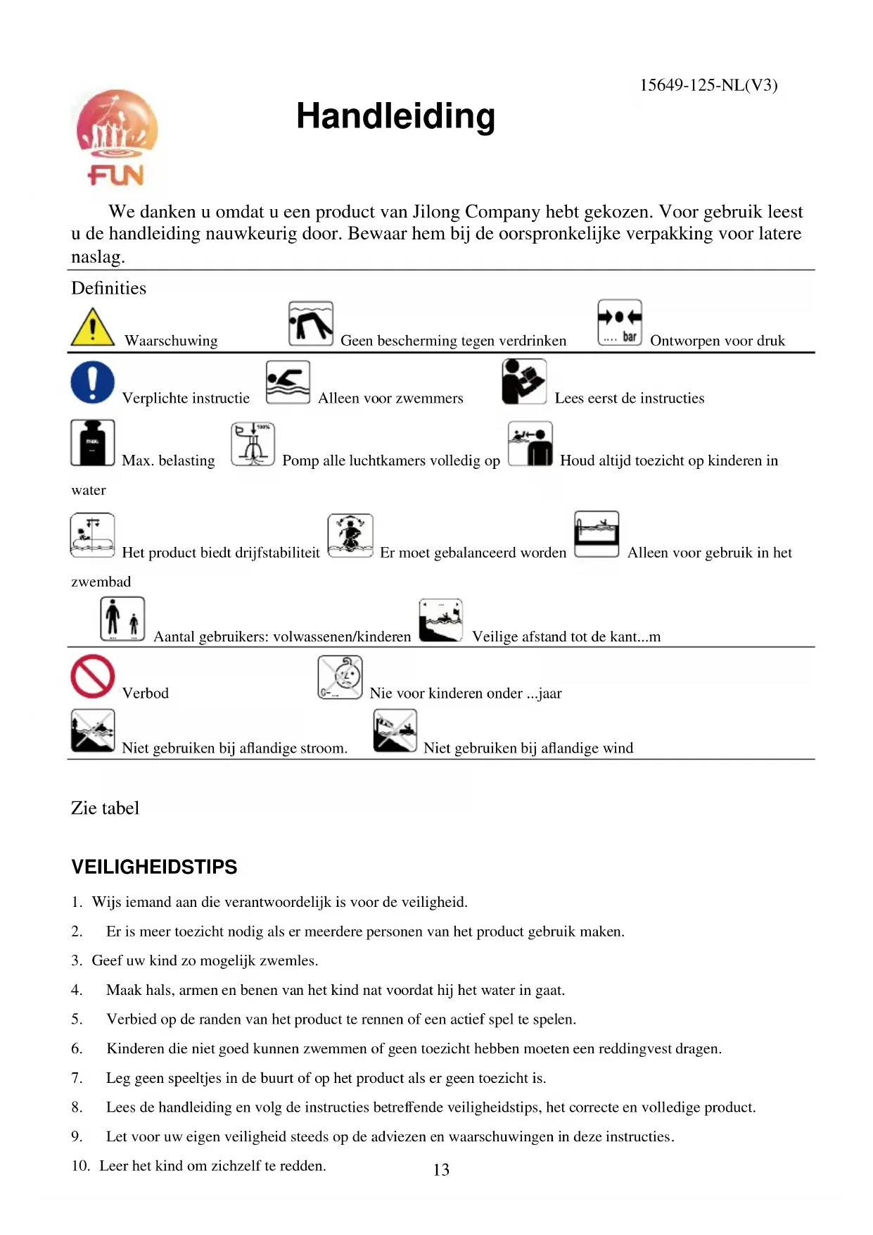 We danken u omdat u een product van Jilong Company hebt gekozen. Voor gebruik leest u de handleiding nauwkeurig door. Bewaar hem bij de oorspronkelijke verpakking voor latere naslag. Definities Waarschuwing Geen bescherming tegen verdrinken Ontworpen voor druk Verplichte instructie Alleen voor zwemmers Lees eerst de instructies Max. belasting Pomp alle luchtkamers volledig op Houd altijd toezicht op kinderen in water Het product biedt drijfstabiliteit Er moet gebalanceerd worden Alleen voor gebruik in het zwembad Aantal gebruikers: volwassenen/kinderen Veilige afstand tot de kant...m Verbod Nie voor kinderen onder ...jaar Niet gebruiken bij aflandige stroom. Niet gebruiken bij aflandige wind Zie tabel VEILIGHEIDSTIPS