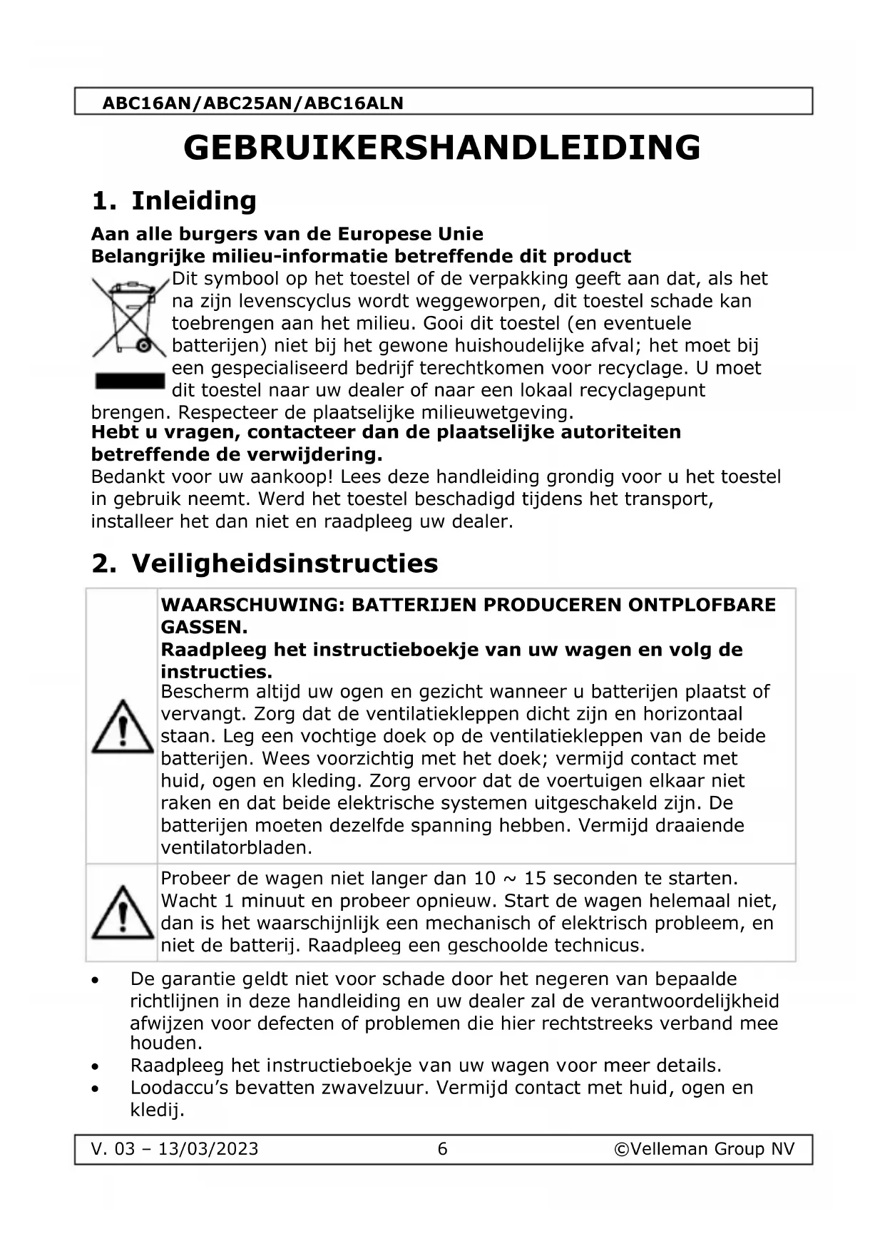 Gebruik dit toestel enkel met originele accessoires. Velleman Group nv is niet aansprakelijk voor schade of kwetsuren bij (verkeerd) gebruik van dit toestel. Voor meer informatie over dit product en de laatste versie van deze handleiding, zie www.perel.eu. De informatie in deze handleiding kan te allen tijde worden gewijzigd zonder voorafgaande kennisgeving. © AUTEURSRECHT Velleman Group nv heeft het auteursrecht voor deze handleiding. Alle wereldwijde rechten voorbehouden. Het is niet toegestaan om deze handleiding of gedeelten ervan over te nemen, te kopiëren, te vertalen, te bewerken en op te slaan op een elektronisch medium zonder voorafgaande schriftelijke toestemming van de rechthebbende.ABC16AN/ABC25AN/ABC16ALN