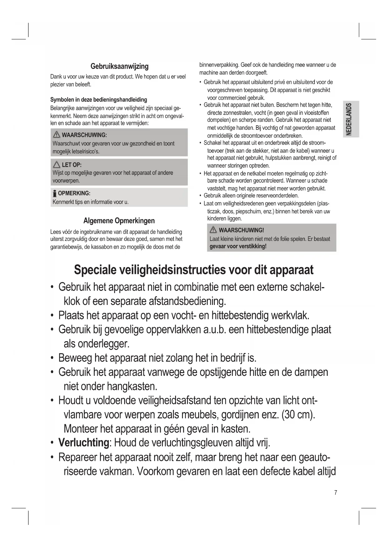 - Laat om veiligheidsredenen geen verpakkingsdelen (plas- ticzak, doos, piepschuim, enz.) binnen het bereik van uw kinderen liggen. WAARSCHUWING! Laat kleine kinderen niet met de folie spelen. Er bestaat gevaar voor verstikking! Speciale veiligheidsinstructies voor dit apparaat