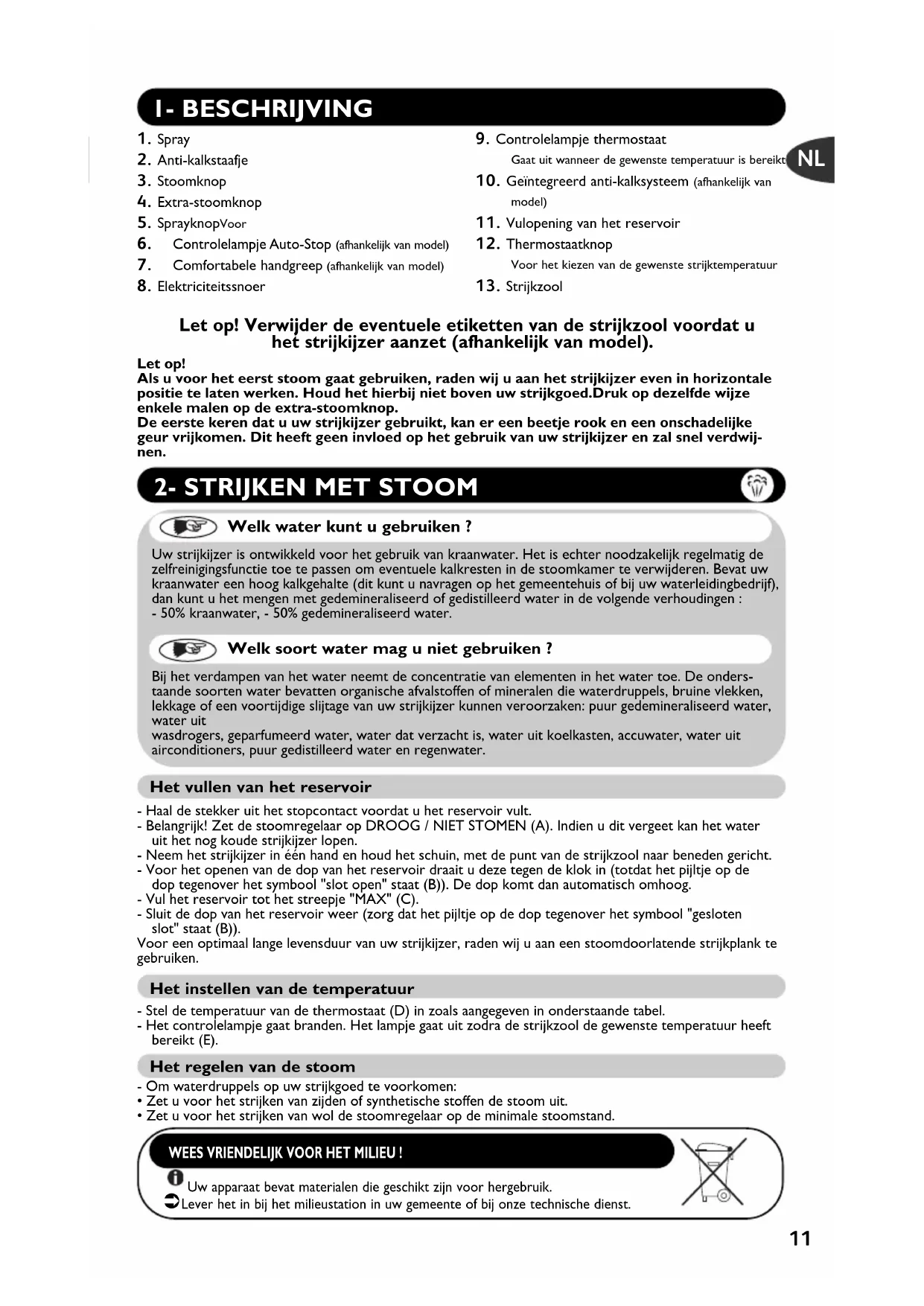 Het vullen van het reservoir - Haal de stekker uit het stopcontact voordat u het reservoir vult.- Belangrijk! Zet de stoomregelaar op DROOG / NIET STOMEN (A). Indien u dit vergeet kan het water uit het nog koude strijkijzer lopen.- Neem het strijkijzer in één hand en houd het schuin, met de punt van de strijkzool naar beneden gericht.- Voor het openen van de dop van het reservoir draait u deze tegen de klok in (totdat het pijltje op de dop tegenover het symbool "slot open" staat (B)). De dop komt dan automatisch omhoog.- Vul het reservoir tot het streepje "MAX" (C).- Sluit de dop van het reservoir weer (zorg dat het pijltje op de dop tegenover het symbool "gesloten slot" staat (B)).Voor een optimaal lange levensduur van uw strijkijzer, raden wij u aan een stoomdoorlatende strijkplank tegebruiken. Het instellen van de temperatuur - Stel de temperatuur van de thermostaat (D) in zoals aangegeven in onderstaande tabel.- Het controlelampje gaat branden. Het lampje gaat uit zodra de strijkzool de gewenste temperatuur heeft bereikt (E).- Om waterdruppels op uw strijkgoed te voorkomen:• Zet u voor het strijken van zijden of synthetische stoffen de stoom uit.• Zet u voor het strijken van wol de stoomregelaar op de minimale stoomstand. Het regelen van de stoom WEES VRIENDELIJK VOOR HET MILIEU ! Uw apparaat bevat materialen die geschikt zijn voor hergebruik. Lever het in bij het milieustation in uw gemeente of bij onze technische dienst.