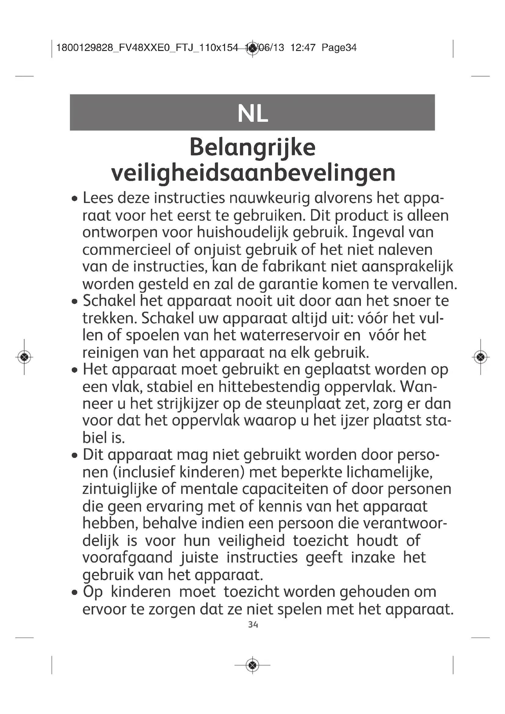 - Op kinderen moet toezicht worden gehouden om ervoor te zorgen dat ze niet spelen met het apparaat. 1800129828_FV48XXE0_FTJ_110x154 18/06/13 12:47 Page34EN