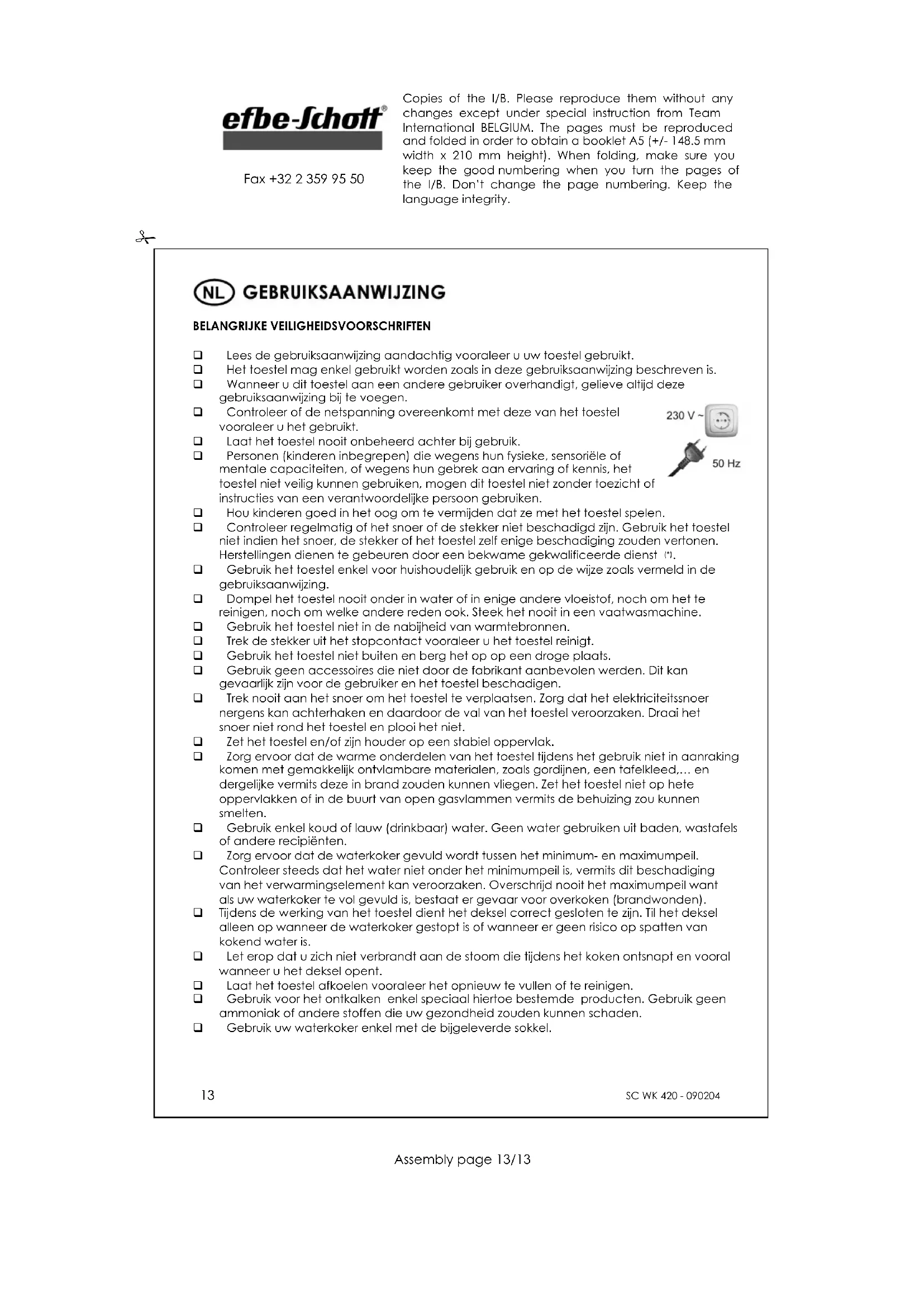 Fax +32 2 359 95 50 ONTKALKEN Wanneer kalkaanslag in de waterkoker zichtbaar wordt, moet u het toestel ontkalken. Gebruik voor het ontkalken van uw waterkoker slechts die producten, die hiervoor in de vakhandel verkrijgbaar zijn, vloeibare ontkalkingsmiddelen, of om milieuvriendelijke redenen azijn. Gelieve bij het ontkalken op de volgende punten te letten: