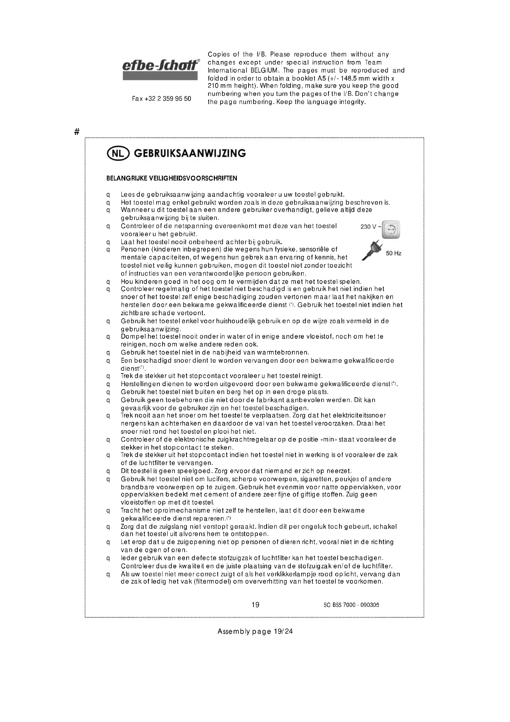 - Ingeval u een slechte werking opmerkt (vermindering van zuigkracht, abnormaal geluid, compleet stoppen van het apparaat), kijk dan eerst of er geen blokkering in de buis of in de flexibele buis is. Zoniet, breng uw apparaat dan voor onderzoek of herstelling naar een erkend technicus.# Copies of the I/B. Please reproduce them without any changes except under special instruction from Team International BELGIUM. The pages must be reproduced and folded in order to obtain a booklet A5 (+/- 148.5 mm width x 210 mm height). When folding, make sure you keep the good numbering when you turn the pages of the I/B. Don’t change the page numbering. Keep the language integrity.