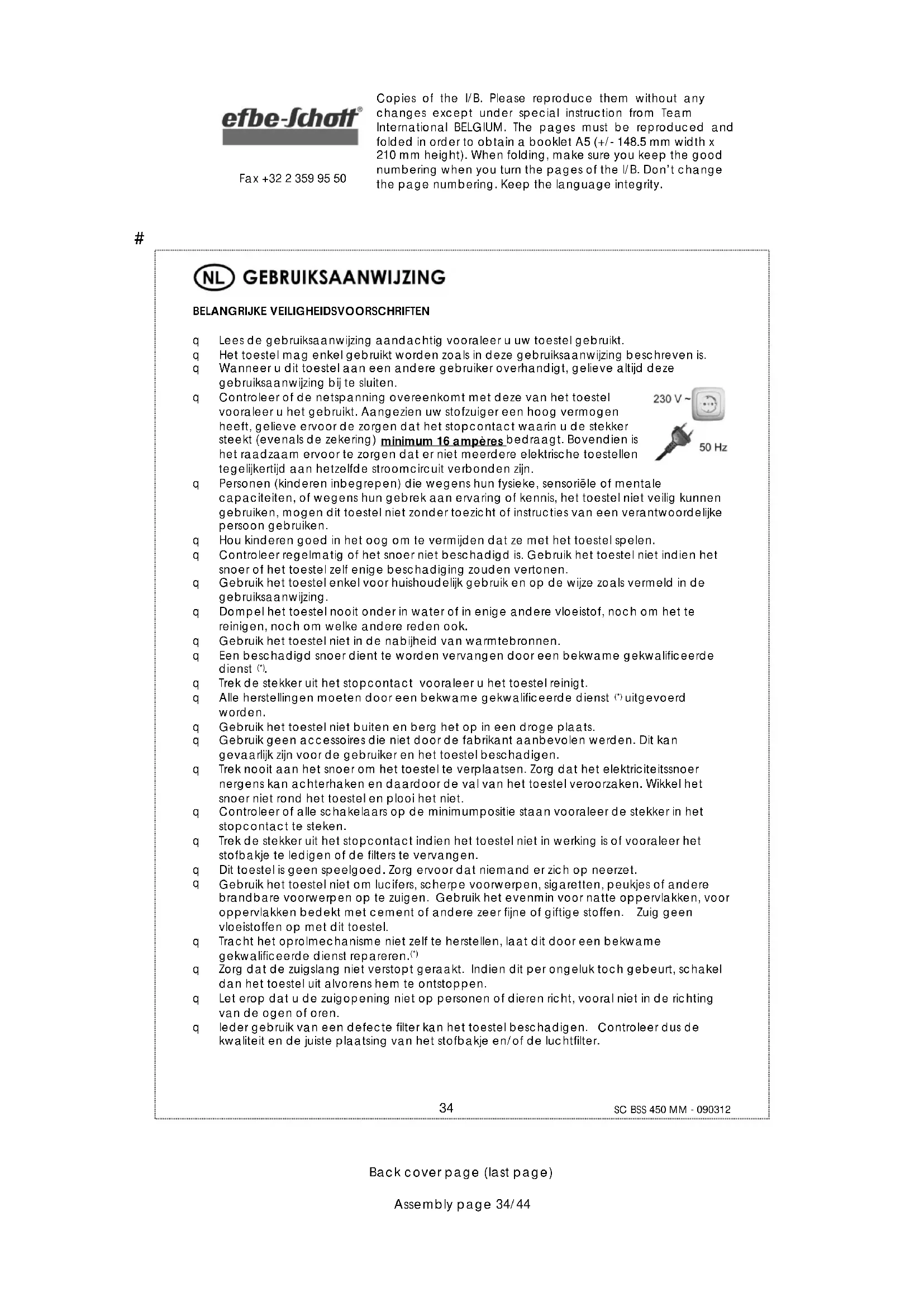 Back cover page (last page) Assembly page 38/44 Fax +32 2 359 95 50 GEBRUIK Opgelet: Het toestel zonder filters gebruiken kan de motor ernstig beschadigen! Gebruik het toestel nooit zonder filters of stofbakje. Instaleer het stofbakje op de juiste manier vooraleer u het toestel gebruikt. Wanneer het toestel gemonteerd is, trek op het snoer op de gewenste lengte uit. Overschrijd nooit de rode markering. Steek de stekker in het stopcontact. Controleer de vulstand van het stofbakje voor elk gebruik en ledig het wanneer het maximumpeil bereikt is (zie paragraaf "Reiniging van het stofbakje en de filters"). Controleer of de zuigkrachtregelaar op MIN staat. Indien niet, schuif hem dan tot deze stand. Schakel het toestel aan door op de aan- /uitschakelaar te drukken.# Copies of the I/B. Please reproduce them without any changes except under special instruction from Team International BELGIUM. The pages must be reproduced and folded in order to obtain a booklet A5 (+/- 148.5 mm width x 210 mm height). When folding, make sure you keep the good numbering when you turn the pages of the I/B. Don’t change the page numbering. Keep the language integrity.