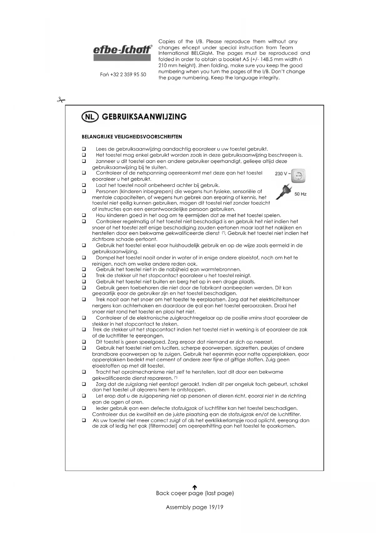 BELANGRIJKE VEILIGHEIDSVOORSCHRIFTEN Lees de gebruiksaanwijzing aandachtig vooraleer u uw toestel gebruikt. Het toestel mag enkel gebruikt worden zoals in deze gebruiksaanwijzing beschreven is. Wanneer u dit toestel aan een andere gebruiker overhandigt, gelieve altijd deze gebruiksaanwijzing bij te sluiten. Controleer of de netspanning overeenkomt met deze van het toestel vooraleer u het gebruikt. Laat het toestel nooit onbeheerd achter bij gebruik. Personen (kinderen inbegrepen) die wegens hun fysieke, sensoriële of mentale capaciteiten, of wegens hun gebrek aan ervaring of kennis, het toestel niet veilig kunnen gebruiken, mogen dit toestel niet zonder toezicht of instructies van een verantwoordelijke persoon gebruiken. Hou kinderen goed in het oog om te vermijden dat ze met het toestel spelen. Controleer regelmatig of het toestel niet beschadigd is en gebruik het niet indien het snoer of het toestel zelf enige beschadiging zouden vertonen maar laat het nakijken en herstellen door een bekwame gekwalificeerde dienst