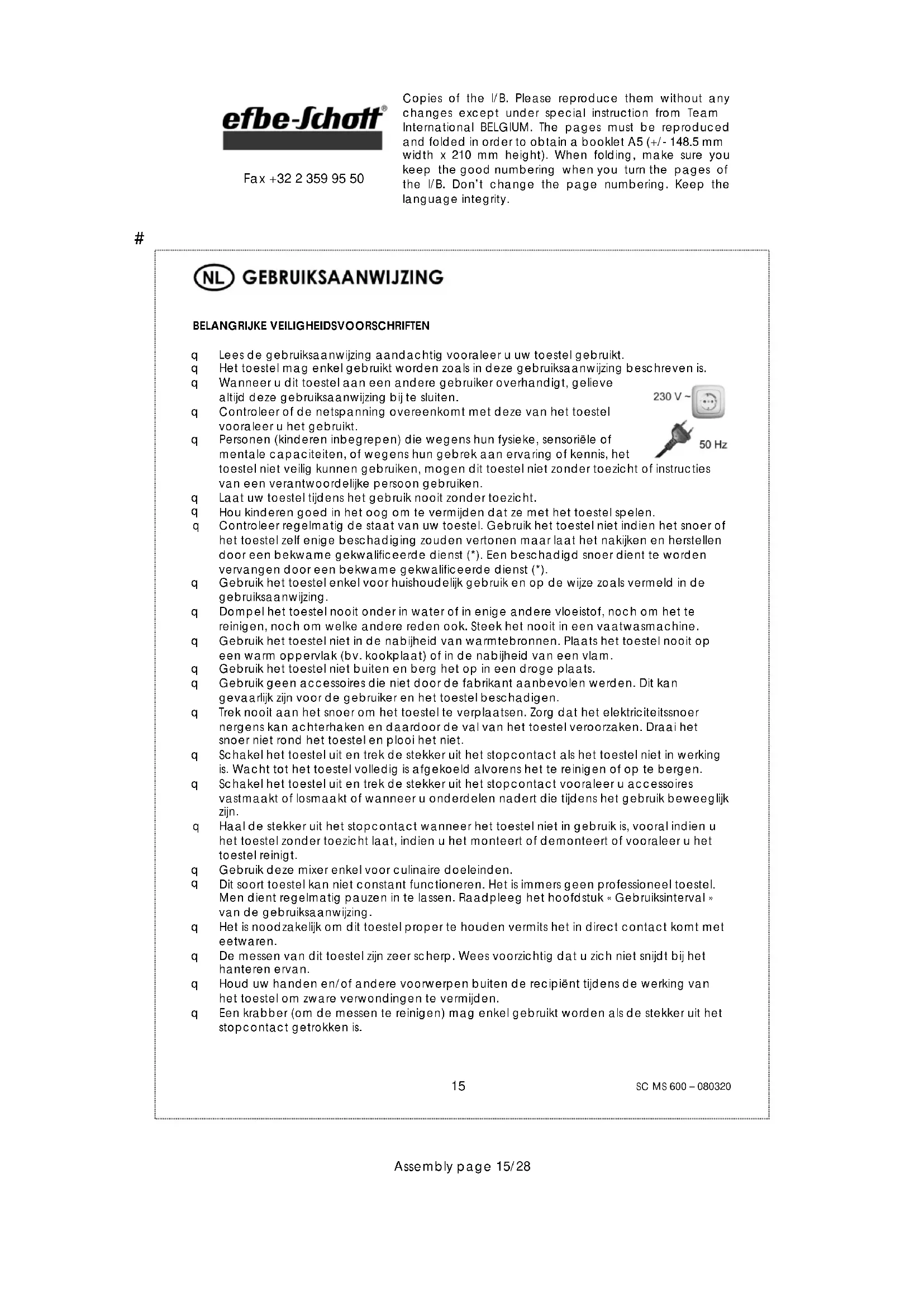 Om ons milieu en onze gezondheid te beschermen, moet afgedankte elektrische en elektronische apparatuur in overeenstemming met welbepaalde regels weggegooid worden. Dit vergt zowel de inzet van de leveranciers als van de gebruikers. Om deze reden mag uw apparaat, zoals op het typeplaatje of op de verpakking aangegeven door het symbool , niet met het gewone huisvuil weggegooid worden. De gebruiker heeft het recht het toestel gratis naar een gemeentelijk centrum van gescheiden inzameling te brengen waar het overeenkomstig de richtlijn hergebruikt, gerecycleerd of voor andere doeleinden gebruikt zal worden.# Copies of the I/B. Please reproduce them without any changes except under special instruction from Team International BELGIUM. The pages must be reproduced and folded in order to obtain a booklet A5 (+/- 148.5 mm width x 210 mm height). When folding, make sure you keep the good numbering when you turn the pages of the I/B. Don’t change the page numbering. Keep the language integrity.