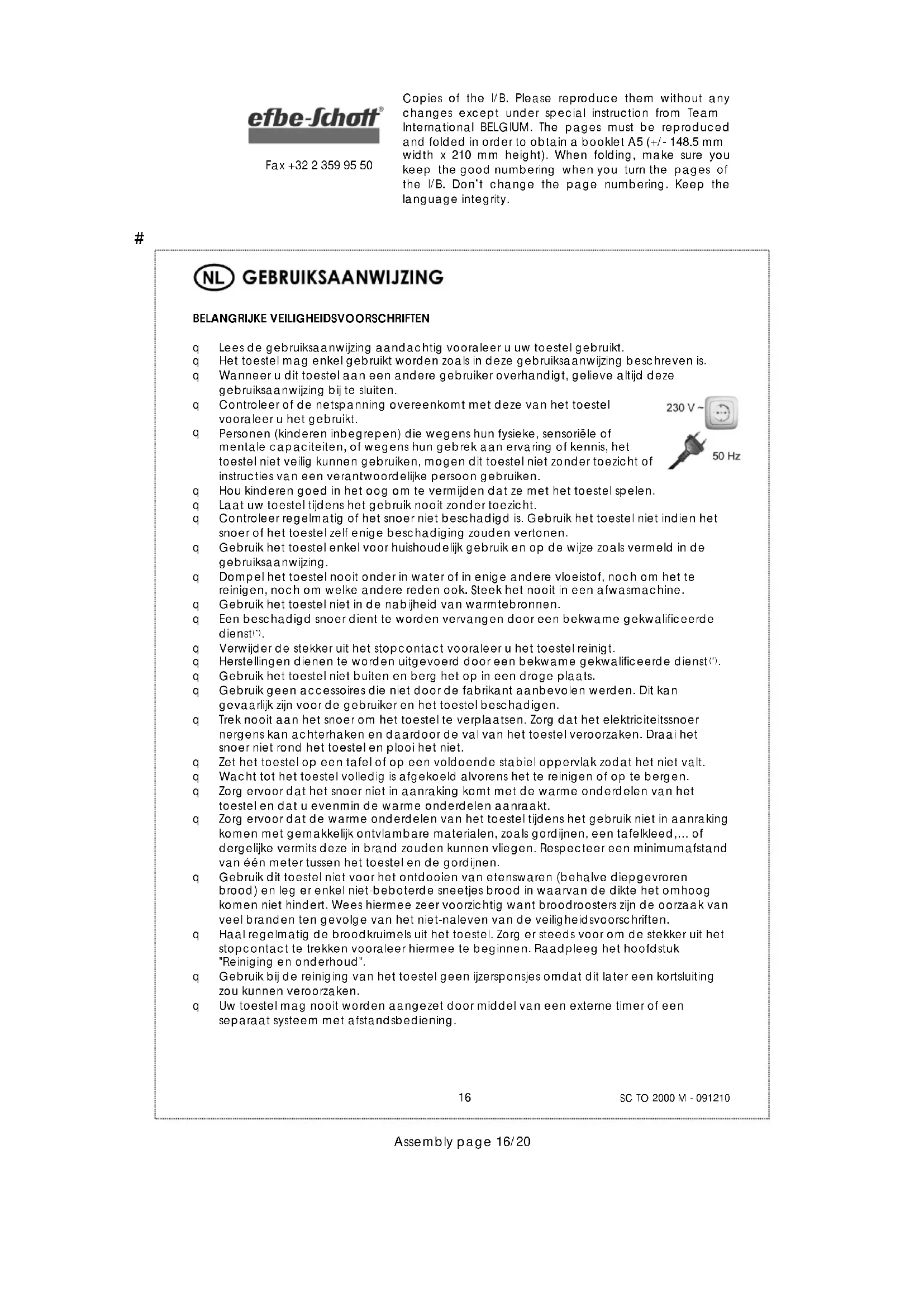 Trek de stekker uit het stopcontact. Schuif de motiefplaten in de daartoe voorziene groeven. Gelieve altijd alle 4 platen te gebruiken, nooit slechts 2, want anders zou uw toast kunnen verbranden. Steek de stekker in het stopcontact. Zet de regelknop voor de bruiningsgraad op stand 6. Druk de schuifknop naar beneden en druk tevens op de knop „DEFROST“. Uw toast wordt nu gebruind en de motieven worden aangebracht. Door automatische uitschakeling wordt het toasten beëindigd en uw toast is dan mooi gebruind. !!!OPGELET!!! De motiefplaten worden zeer heet tijdens het gebruik. Gevaar voor brandwonden!# Copies of the I/B. Please reproduce them without any changes except under special instruction from Team International BELGIUM. The pages must be reproduced and folded in order to obtain a booklet A5 (+/- 148.5 mm width x 210 mm height). When folding, make sure you keep the good numbering when you turn the pages of the I/B. Don’t change the page numbering. Keep the language integrity.