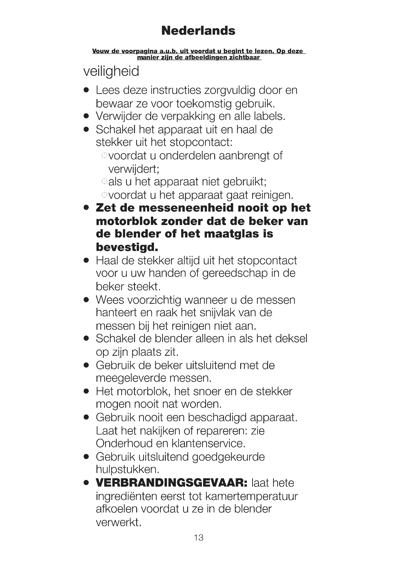 VLOEISTOFFEN Om de kans op brandwonden te verkleinen bij het mengen van hete ingrediënten, moet u uw handen en andere onbeschermde huid uit de buurt van het deksel houden om eventuele brandwonden te voorkomen. De volgende voorzorgsmaatregelen moeten worden getroffen:G VOORZICHTIG: het mengen van zeer hete ingrediënten kan tot gevolg hebben dat hete vloeistof en stoom plotseling uit het deksel of de vuldop worden gedreven .