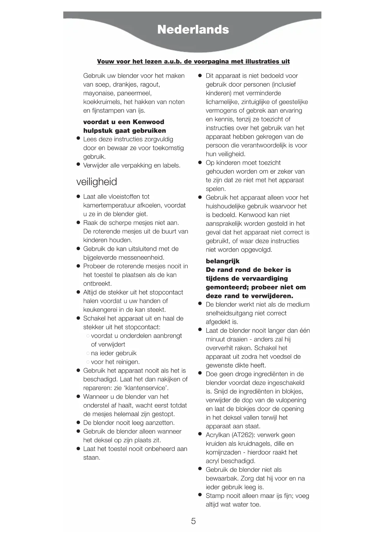 Gebruik het apparaat alleen voor het huishoudelijke gebruik waarvoor het is bedoeld. Kenwood kan niet aansprakelijk worden gesteld in het geval dat het apparaat niet correct is gebruikt, of waar deze instructies niet worden opgevolgd. belangrijk De rand rond de beker is tijdens de vervaardiging gemonteerd; probeer niet om deze rand te verwijderen.