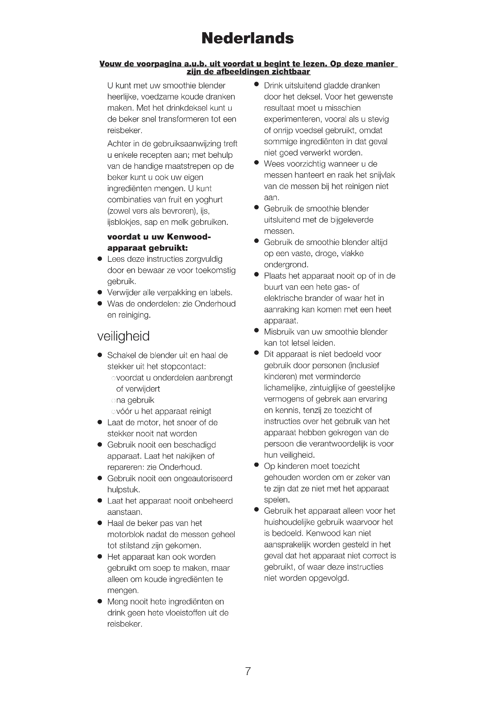 Gebruik het apparaat alleen voor het huishoudelijke gebruik waarvoor het is bedoeld. Kenwood kan niet aansprakelijk worden gesteld in het geval dat het apparaat niet correct is gebruikt, of waar deze instructies niet worden opgevolgd.